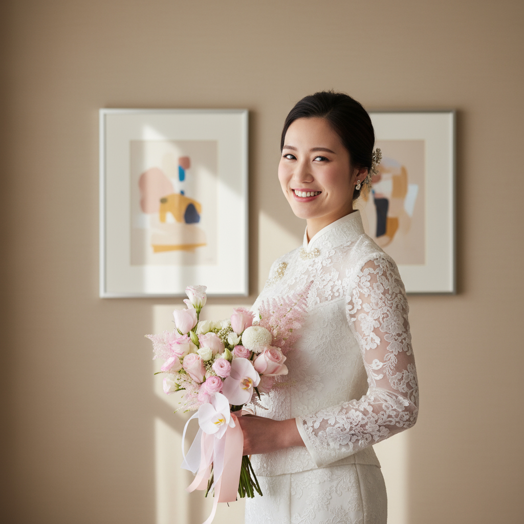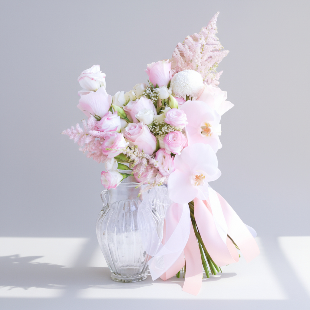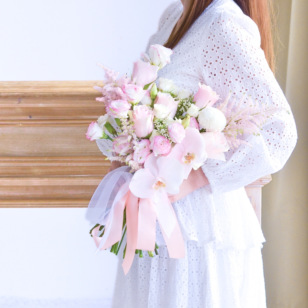 The “Pink I Do Bridal Bouquet” is a romantic and delicate arrangement featuring soft pink roses, elegant pink eustoma, and graceful white orchids. This bouquet exudes love and tenderness, with its gentle pink hues complemented by the purity of white orchids, making it the perfect choice for a bride who wants to express her heartfelt emotions on her special day. 🌸🌷🤍