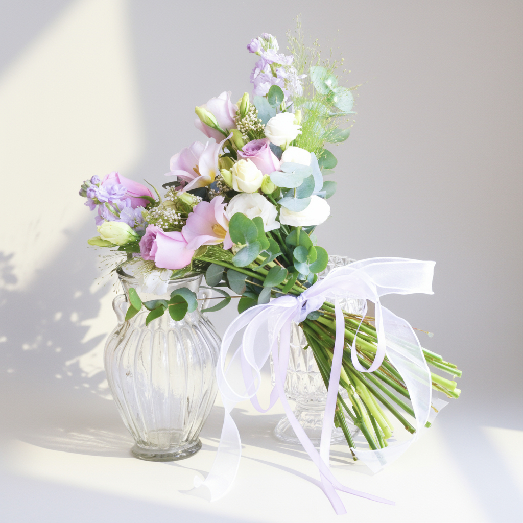 The “Purple Haze Bridal Bouquet” is a dreamy and enchanting arrangement featuring rich purple roses, delicate spray purple tulips, and soft lilac matthiola. This bouquet combines various shades of purple to create a harmonious and elegant look, perfect for a bride who desires a touch of romance and sophistication on her special day. 💜🌹🌷