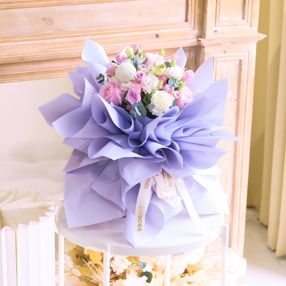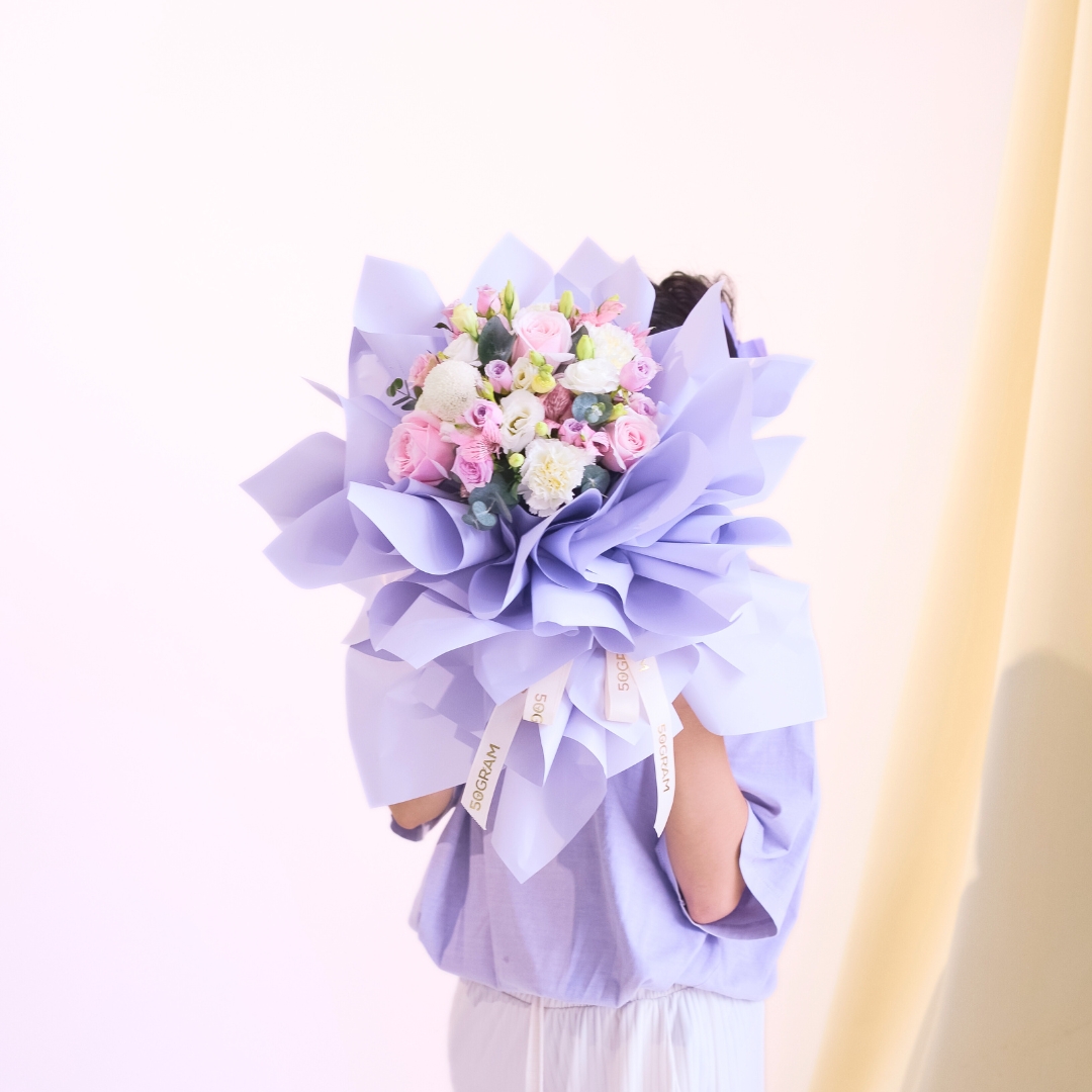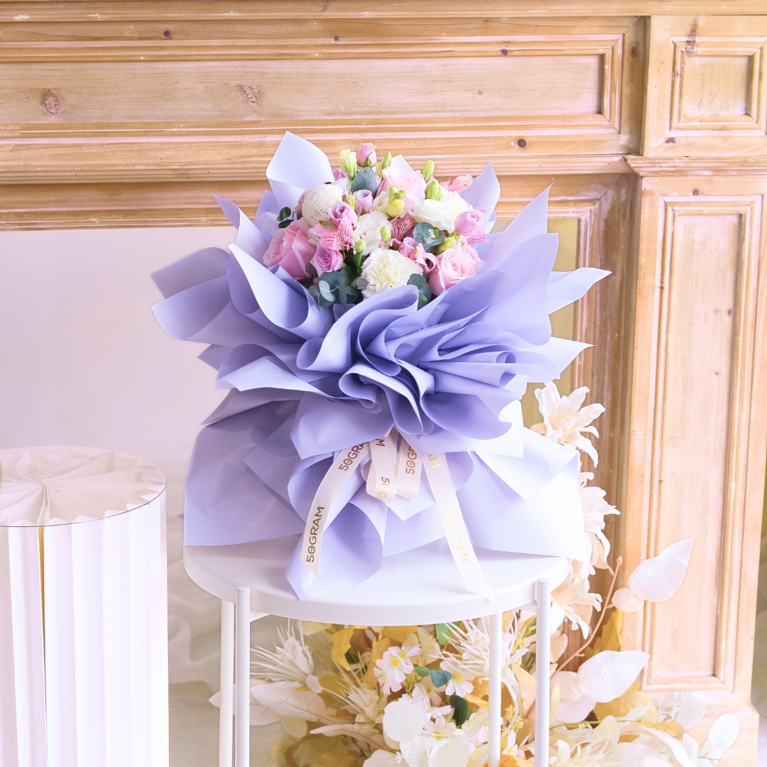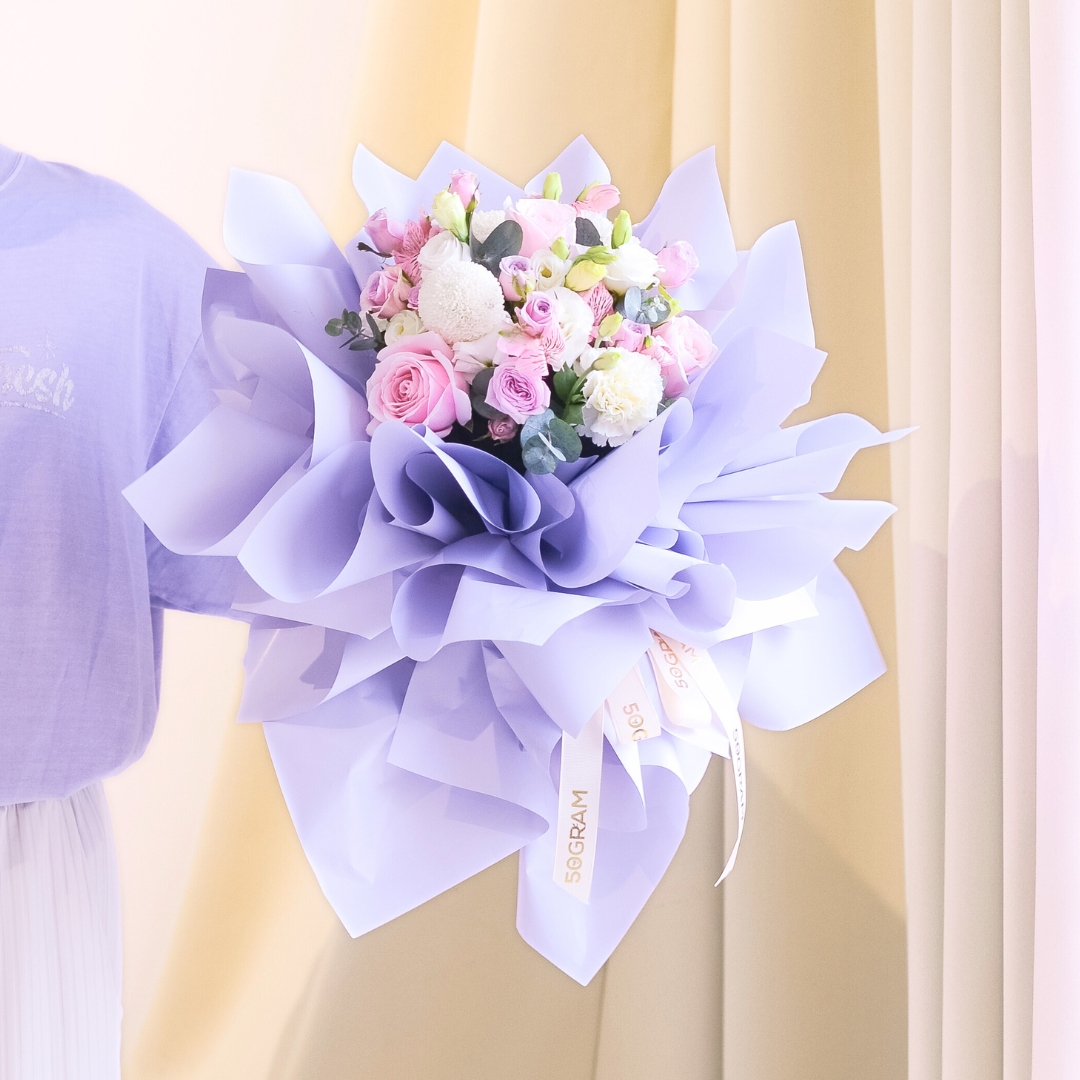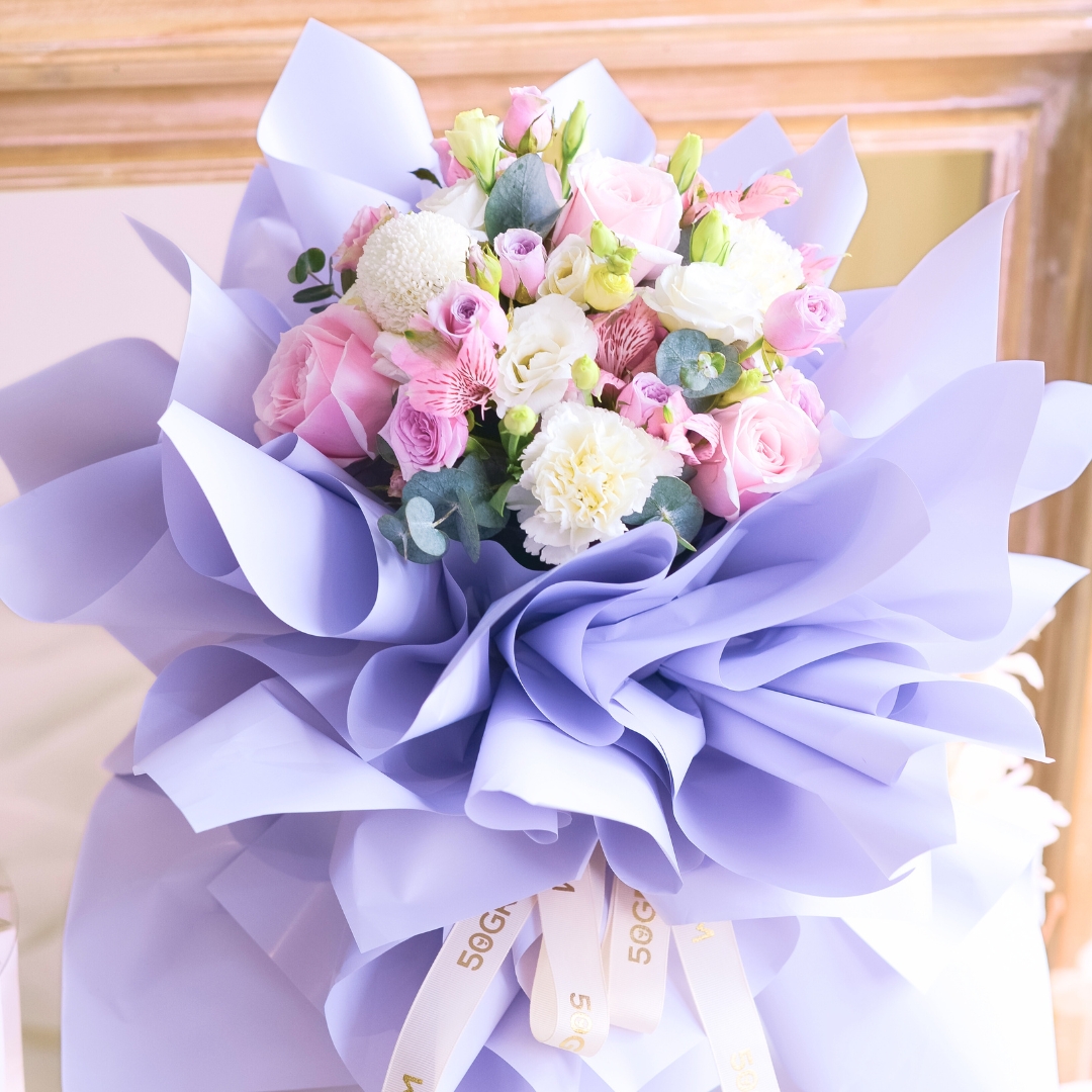 This round shape bouquet comes with Pink Rose x 5, White Ping Pong x 2, White Carnation x 3, Purple Spray Rose, Pink Alstroemria, White Eustoma & Eucalyptus.
