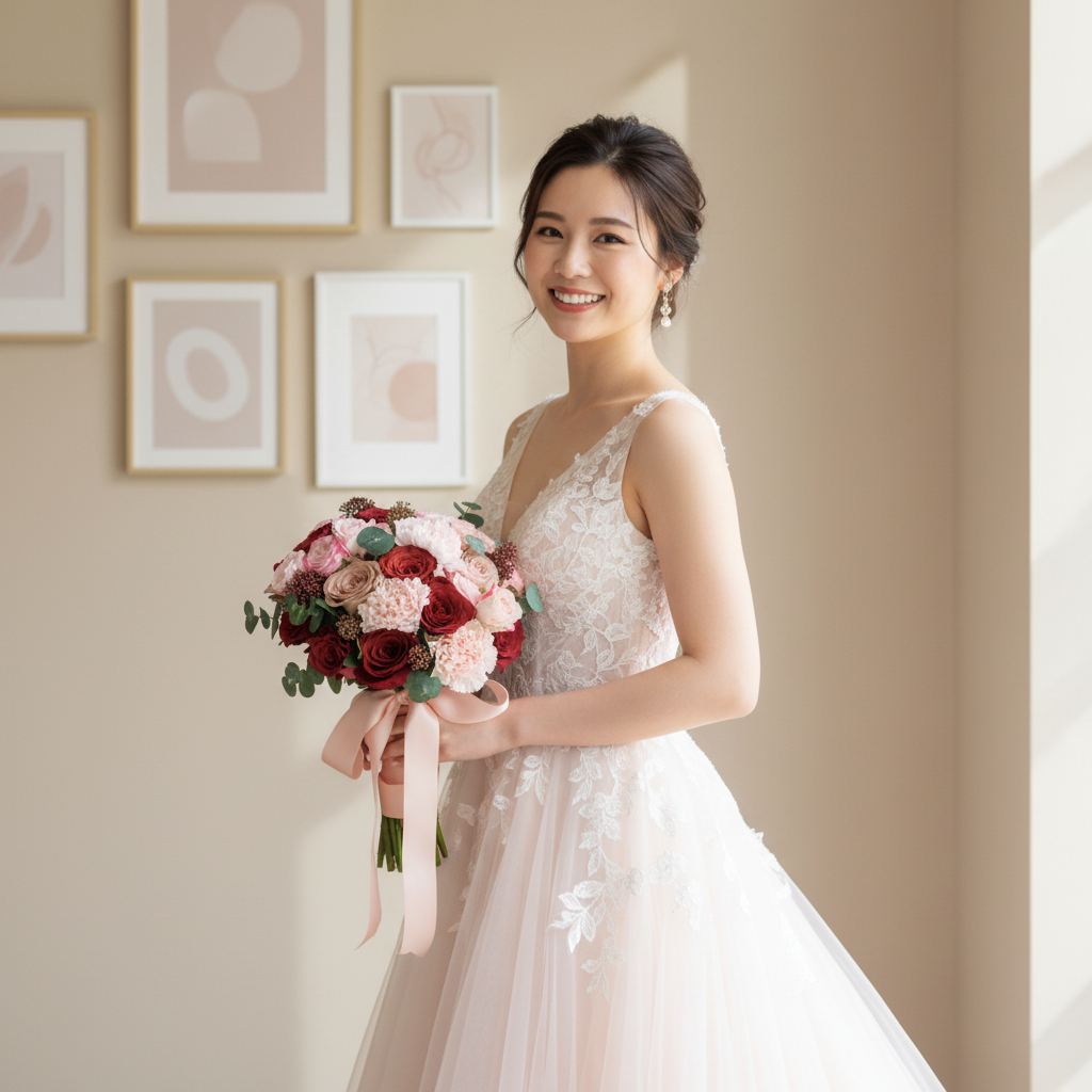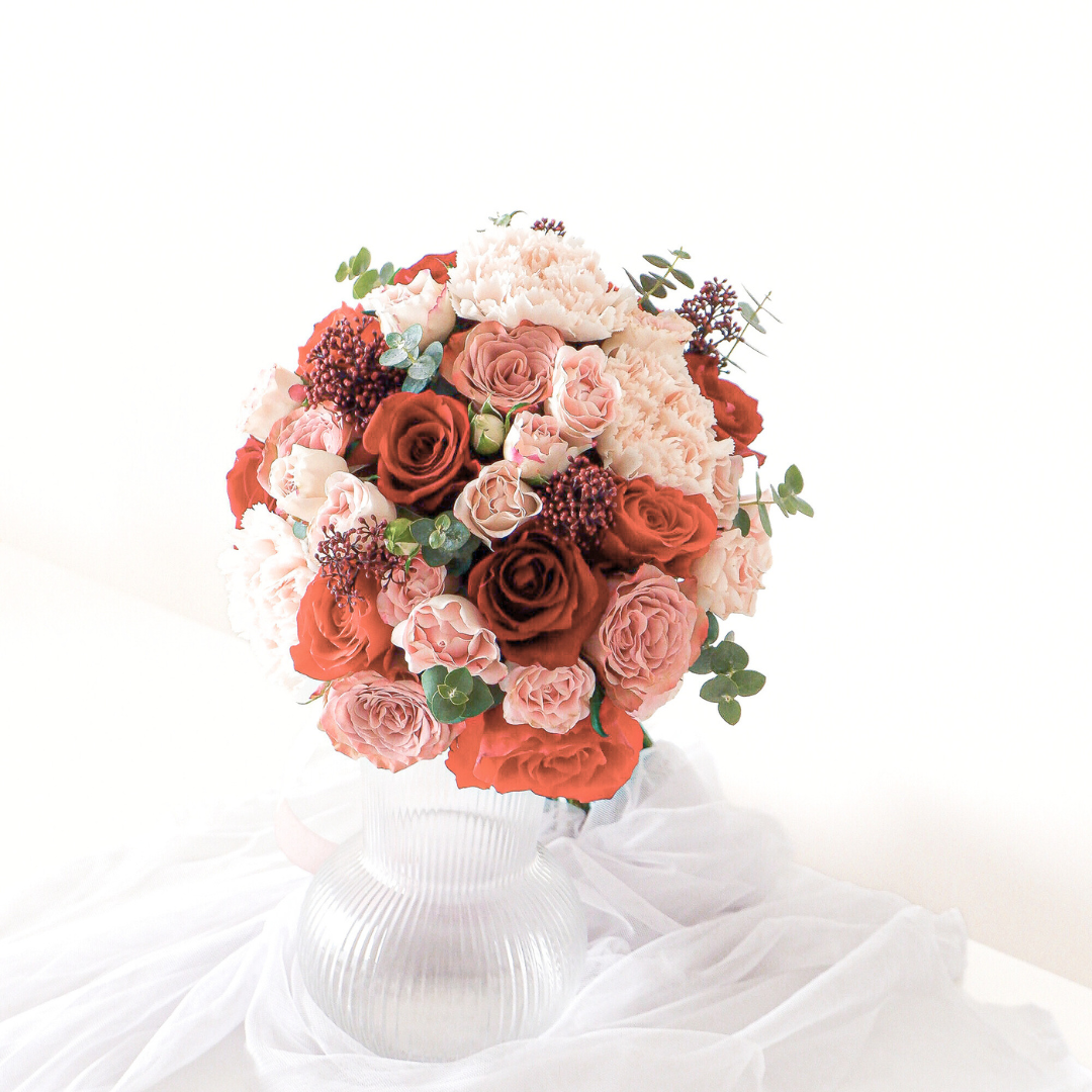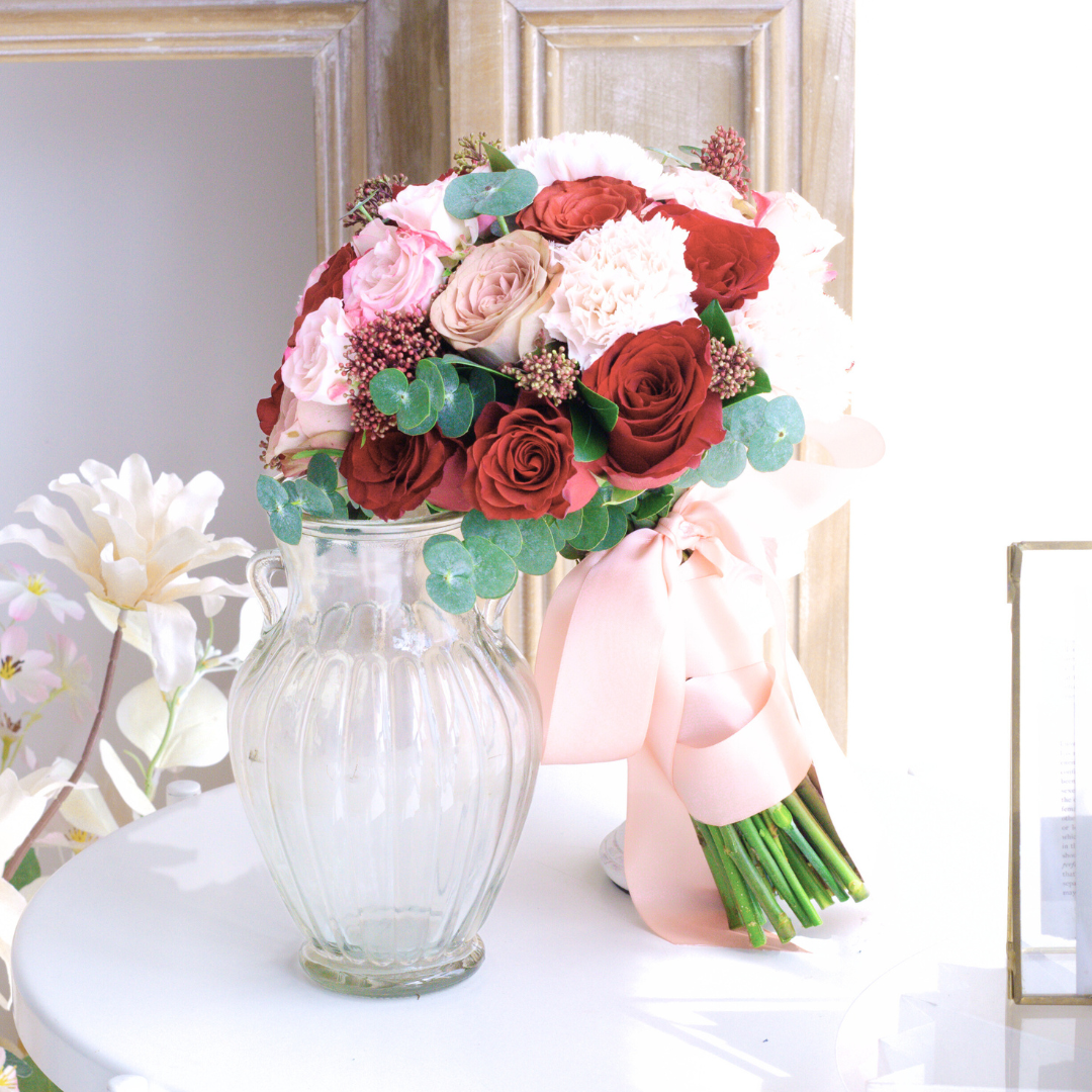 Red Darling bridal bouquet come with 6 red rose, 6 chilli red rose, 4 cappuccino rose, blush carnation, spray rose blush, skimmia & eucalyptus baby blue.
