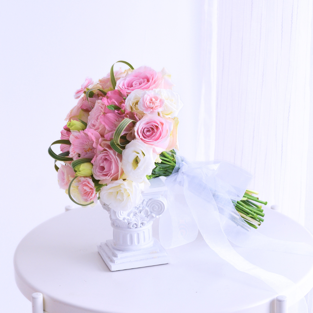 The Roseate Embrace Bridal Bouquet is a harmonious blend of delicate blooms, uniting the soft allure of pink roses, the grace of pink alstroemeria, and the ethereal beauty of white eustoma. This exquisite bouquet embodies the warmth of affection and the purity of a new beginning.