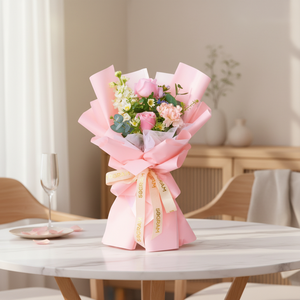 Featuring delicate pink roses and soft pink carnations, this bouquet radiates admiration and appreciation. Fragrant white matthiola adds a gentle elegance, while fresh foliage brings natural balance and texture. Wrapped in a sweet pink wrap, the overall look is feminine, uplifting, and heartfelt.