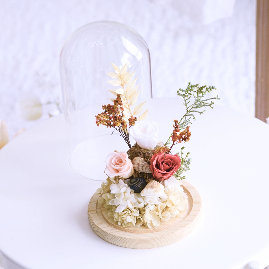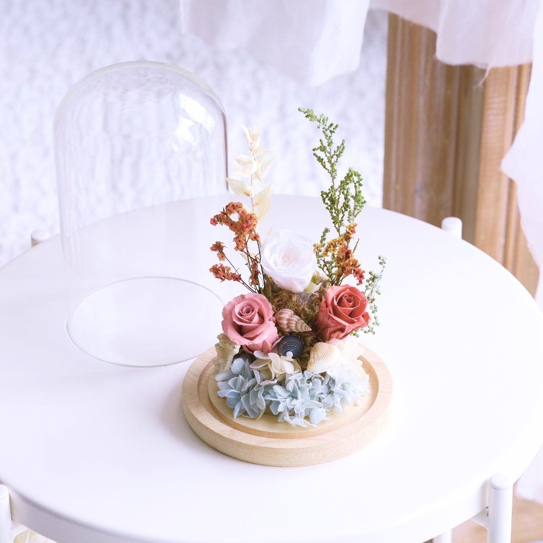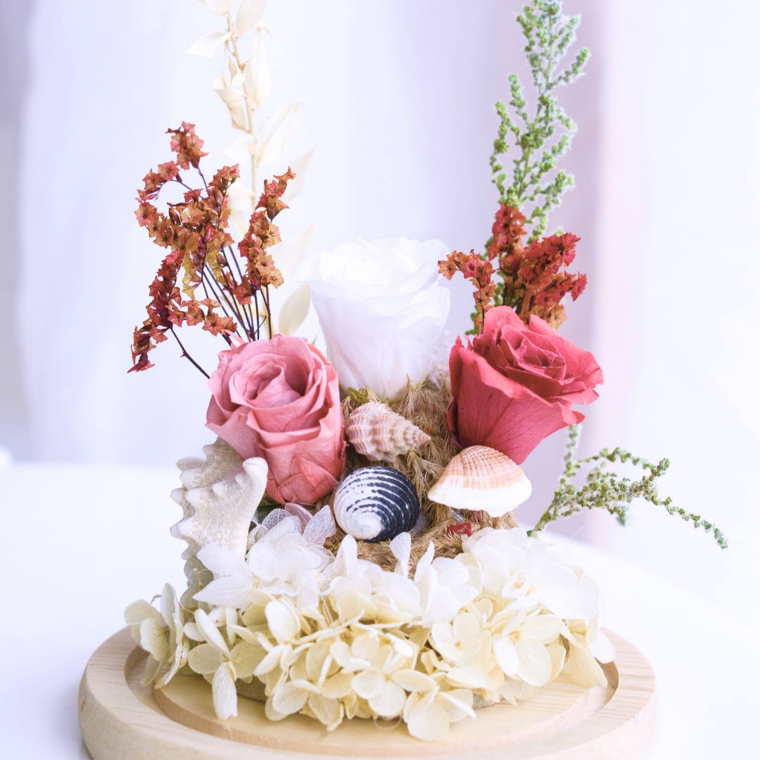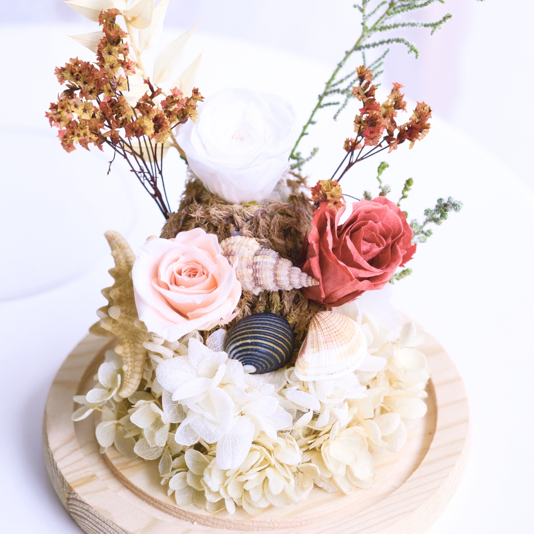 The “Sandy Shores Preserved Flower” arrangement captures the essence of the seaside with preserved flowers, starfish, and seashell props. This charming display evokes memories of sandy beaches and ocean breezes, making it a perfect decorative piece to bring coastal beauty into your home. 🌸🌊🦀