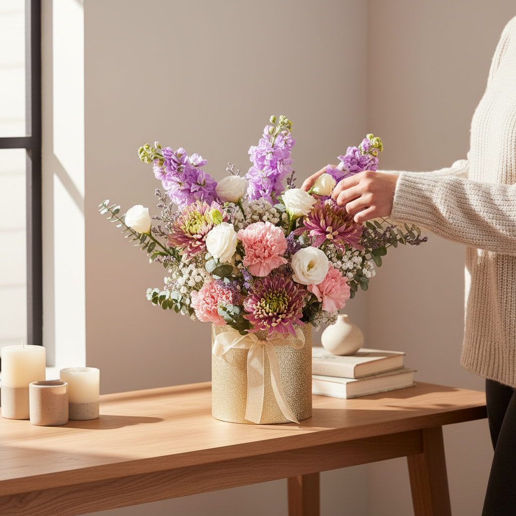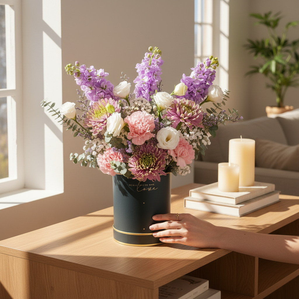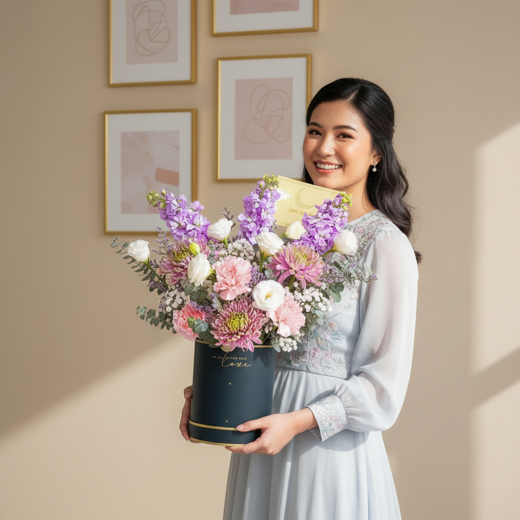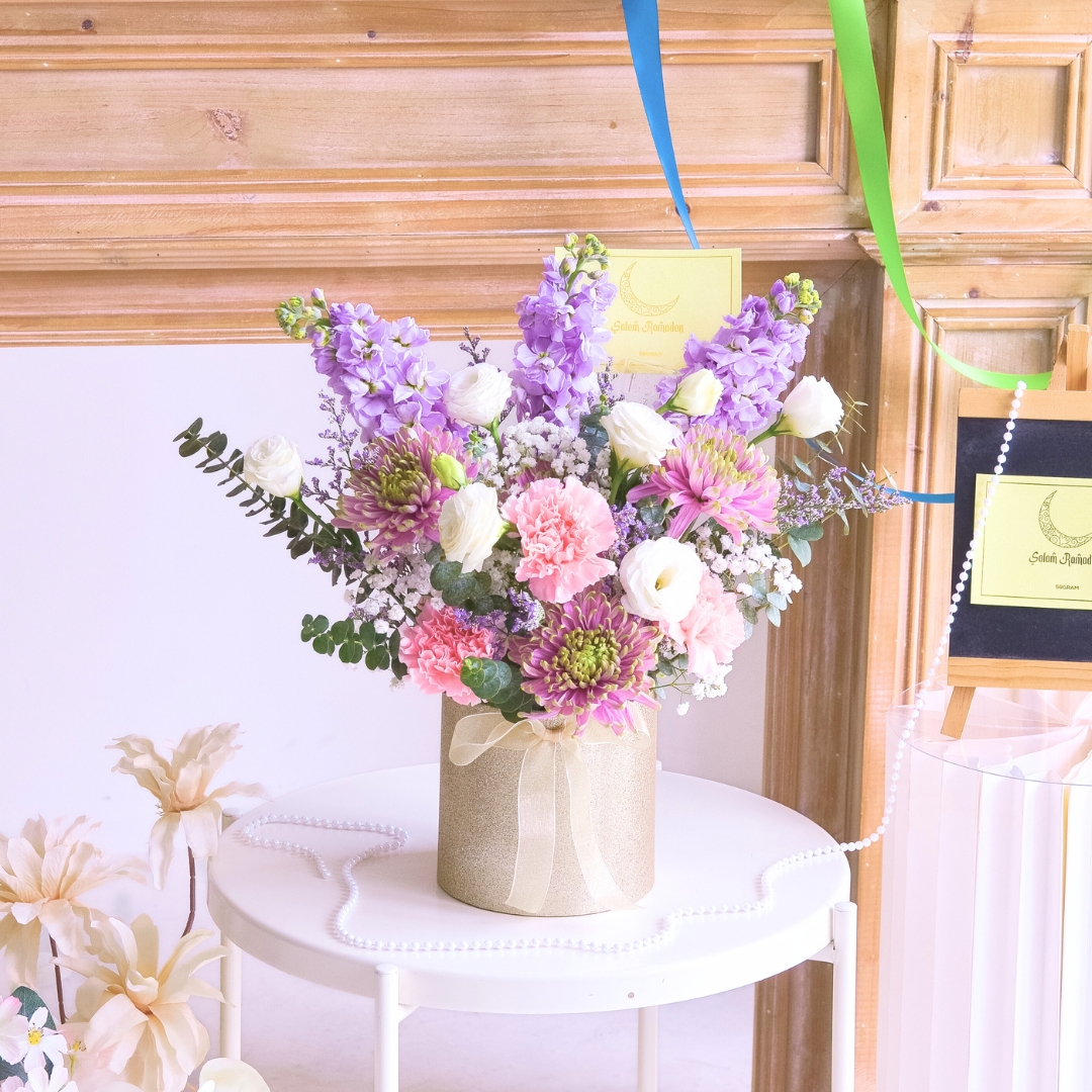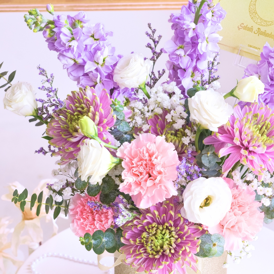 Mark the joyous occasion of Eid with the Seri Aidilfitri Ramadan Flower Box, a delicate and elegant arrangement that radiates beauty and grace. The soft, regal tones of the purple net mum are complemented by the purity of white eustoma and the gentle hues of lilac matthiola. Accents of pink carnations add a touch of tenderness, while the dainty white baby’s breath and purple caspia infuse the arrangement with subtle charm. Soft touches of baby blue florals add a serene contrast, all beautifully arranged in a sophisticated champagne-colored flower box. This delightful flower box is perfect for bringing a sense of harmony and joy to any space during the Ramadan and Aidilfitri celebrations, creating a memorable tribute to the festive season.