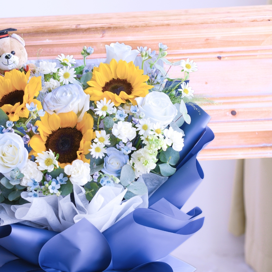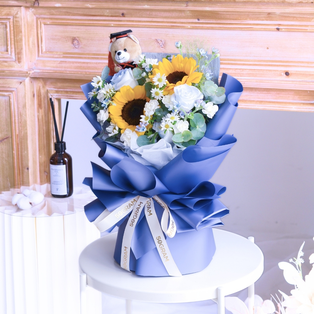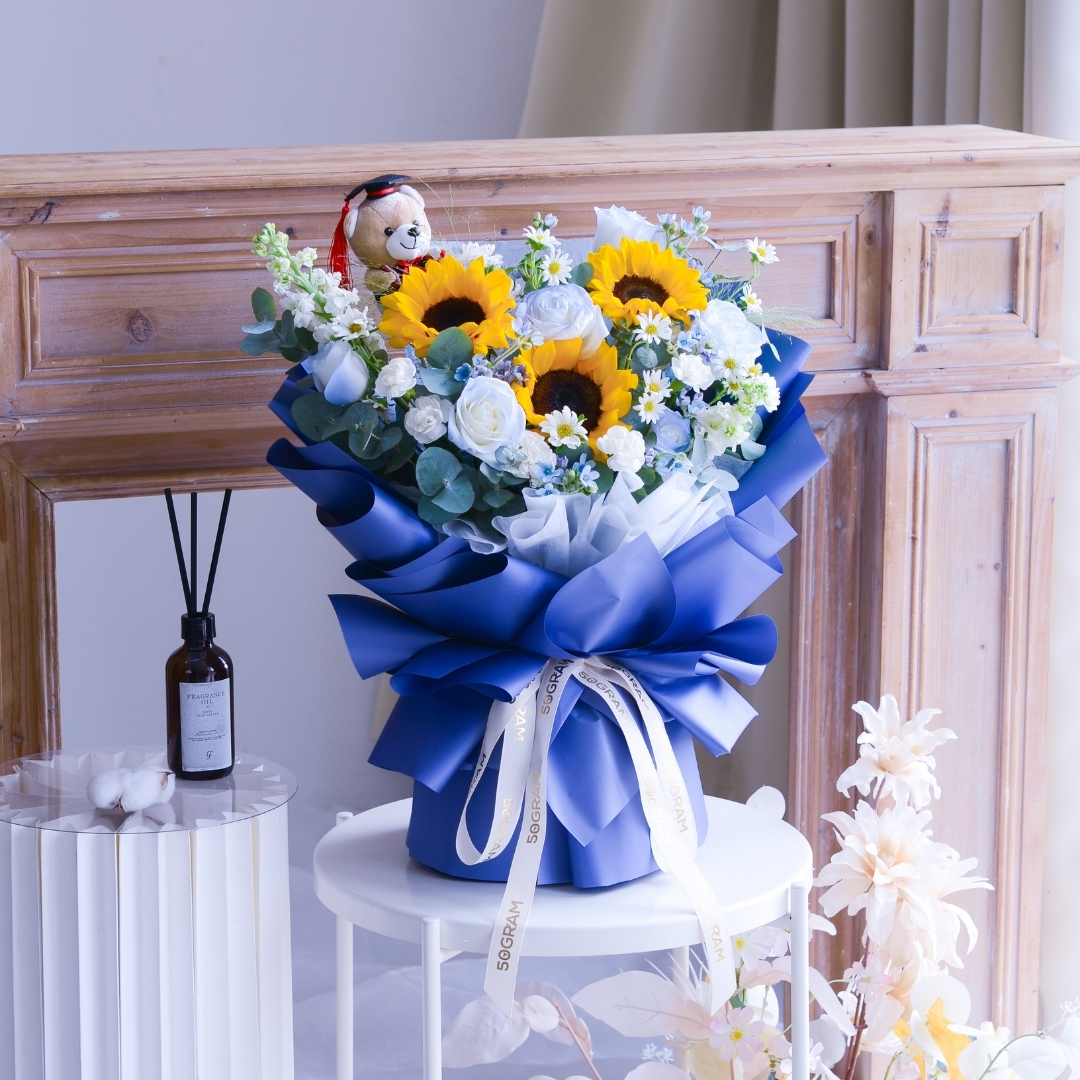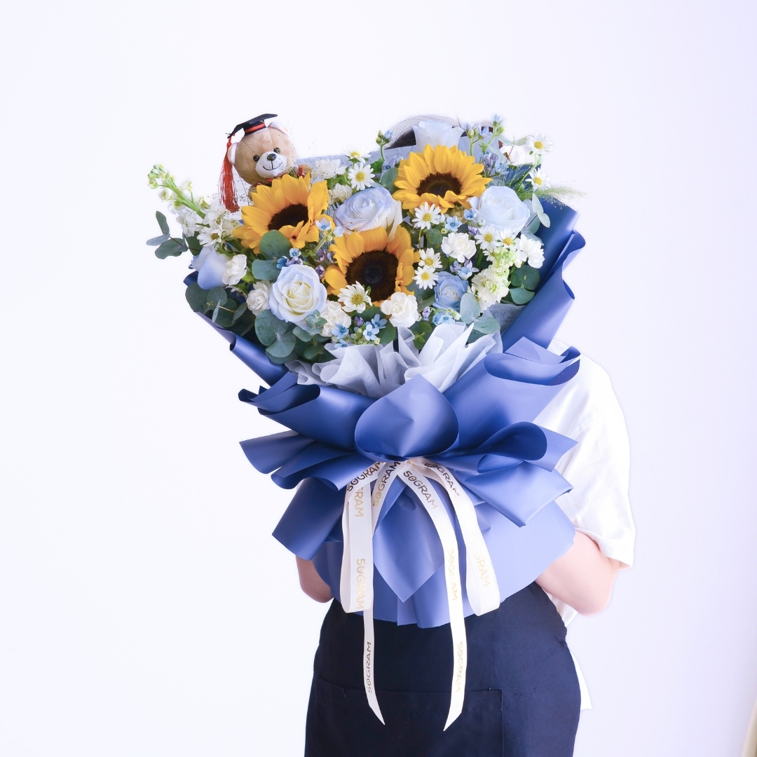 Medium Size comes with Sunflower x 2, White Rose (Spray Blue) x 2, Hannah, Oxypetalum Blue, Spray Carnation White, Foutain Paniucum, Graduation Bear (12CM) & Eucalyptus.