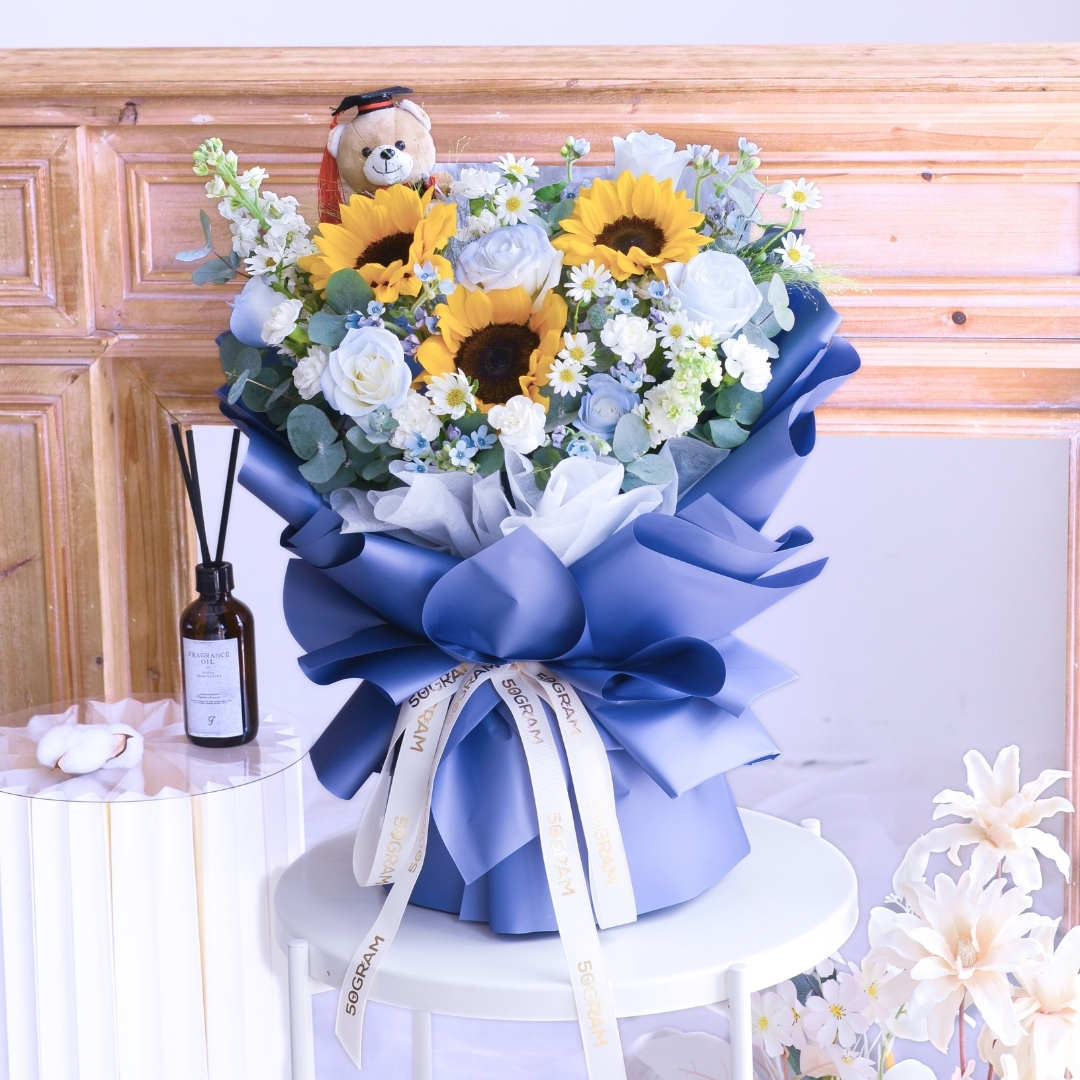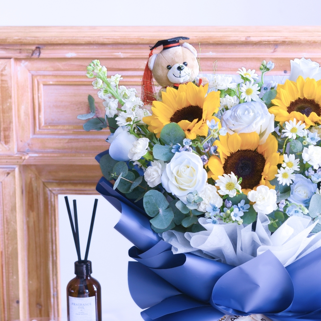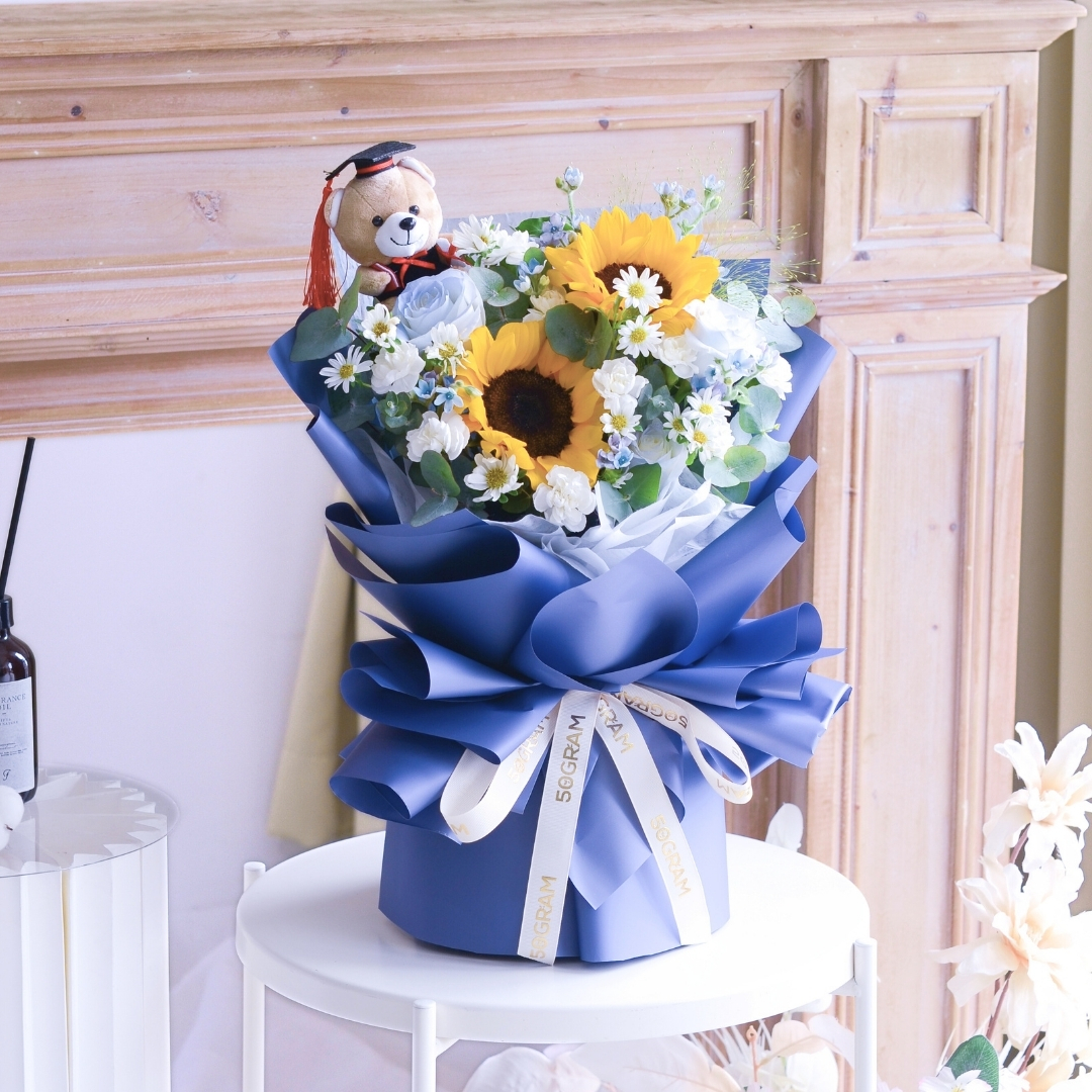 Medium Size comes with Sunflower x 2, White Rose (Spray Blue) x 2, Hannah, Oxypetalum Blue, Spray Carnation White, Foutain Paniucum, Graduation Bear (12CM) & Eucalyptus.