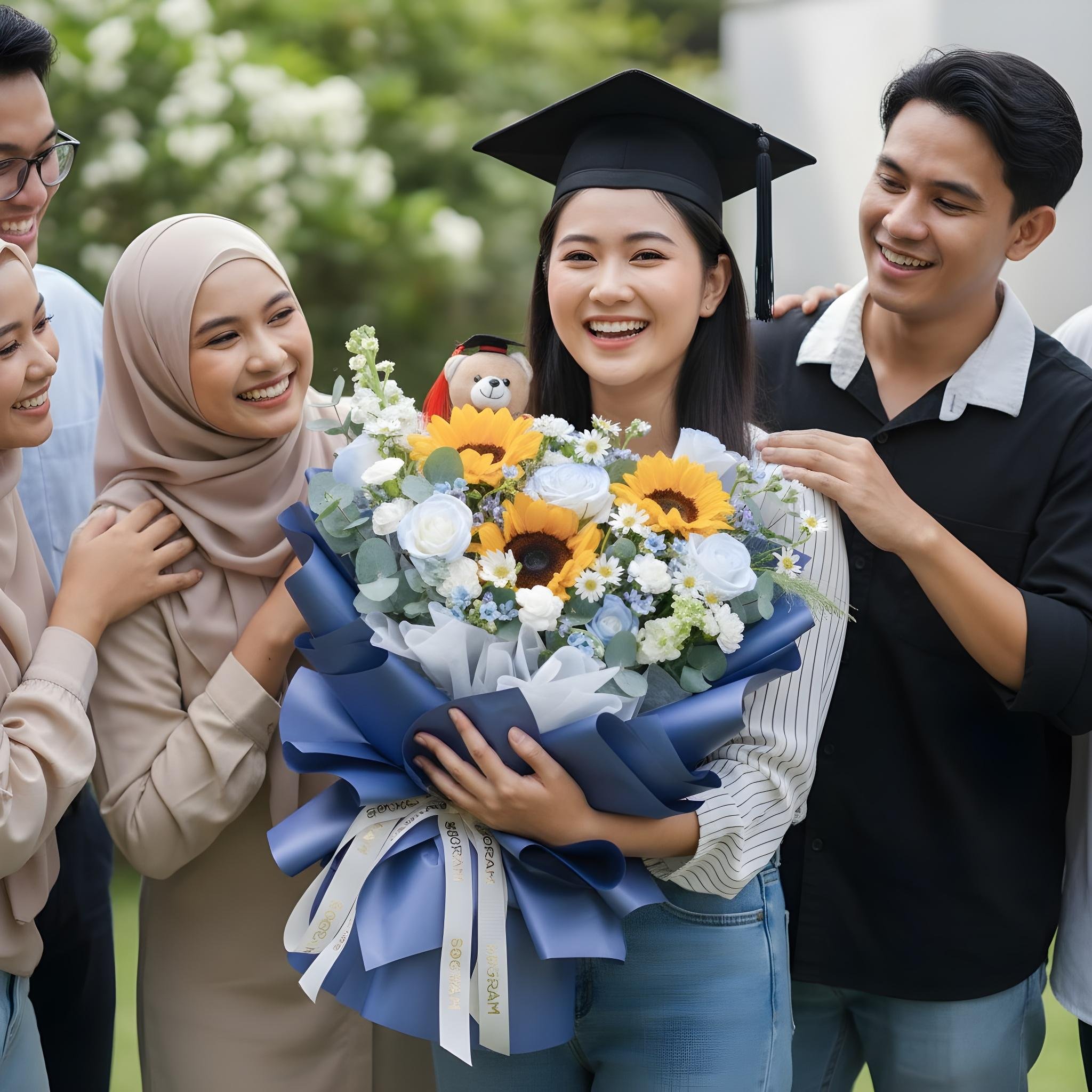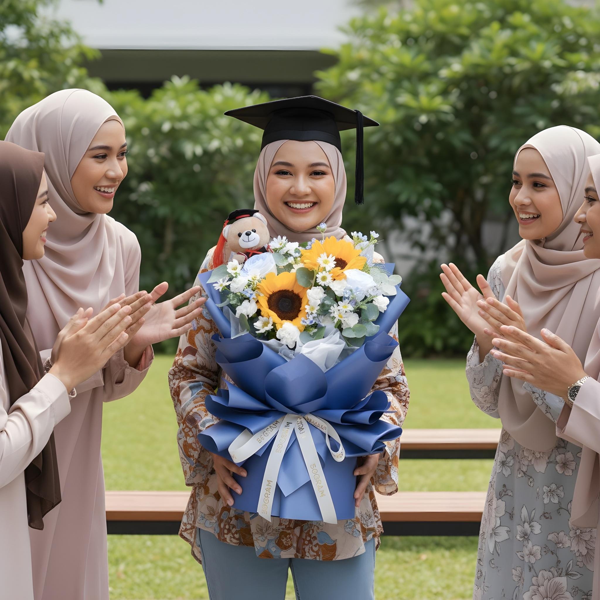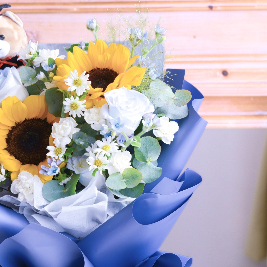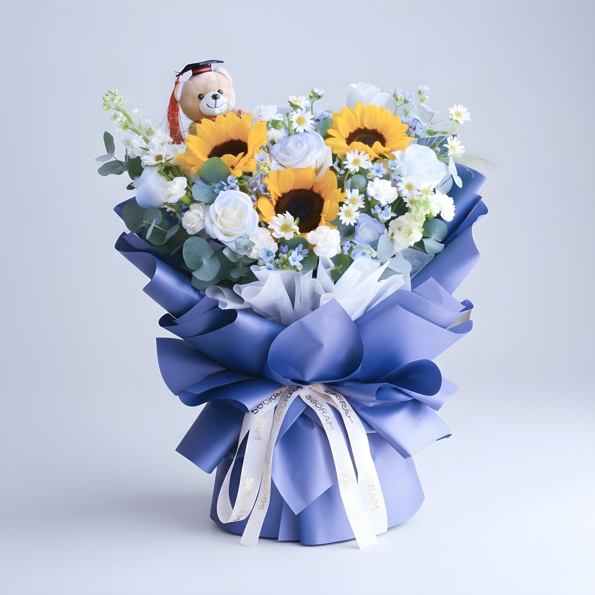 Medium Size comes with Sunflower x 2, White Rose (Spray Blue) x 2, Hannah, Oxypetalum Blue, Spray Carnation White, Foutain Paniucum, Graduation Bear (12CM) & Eucalyptus.