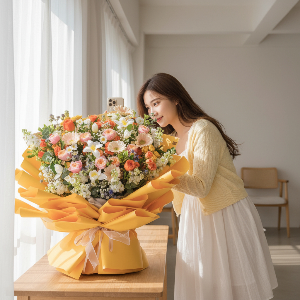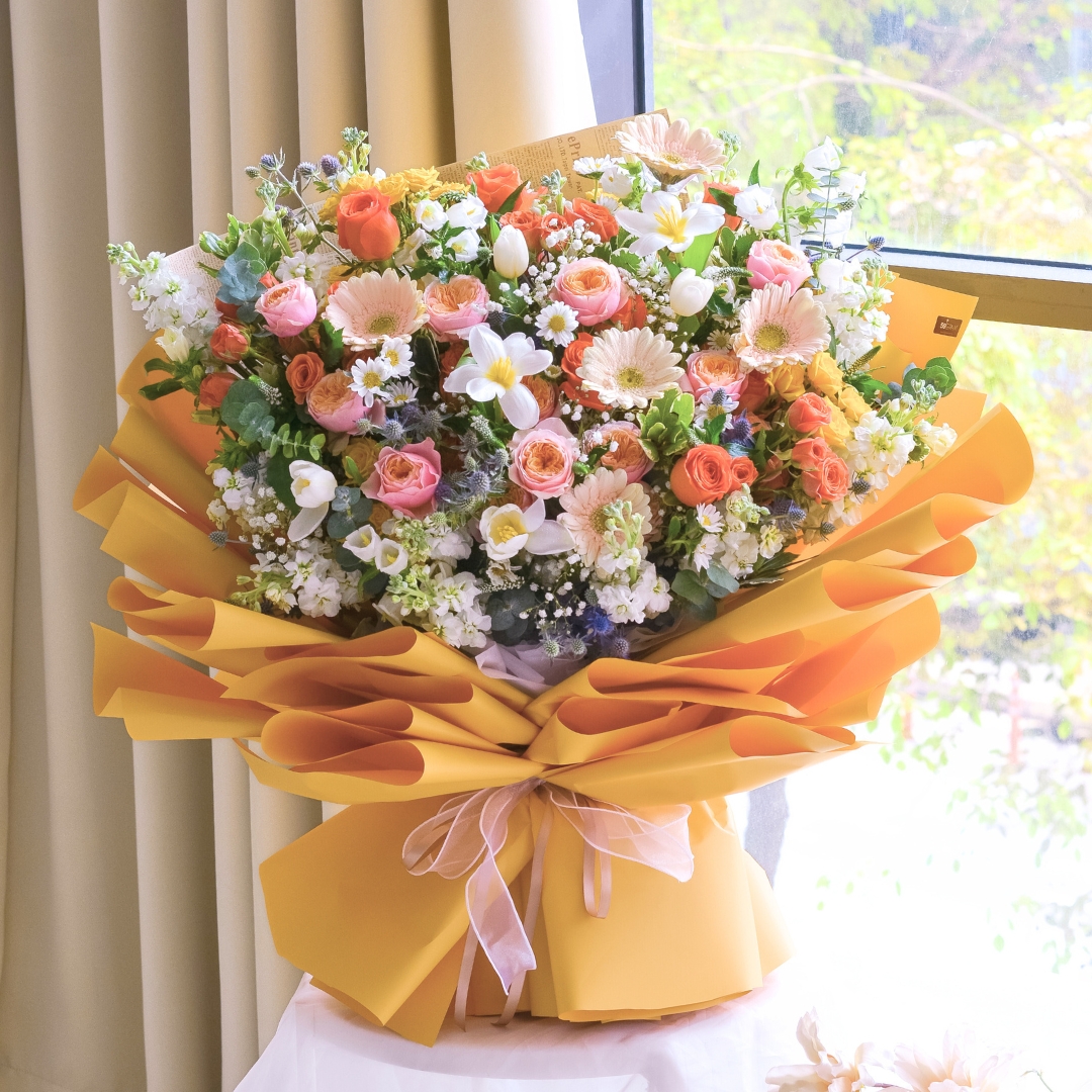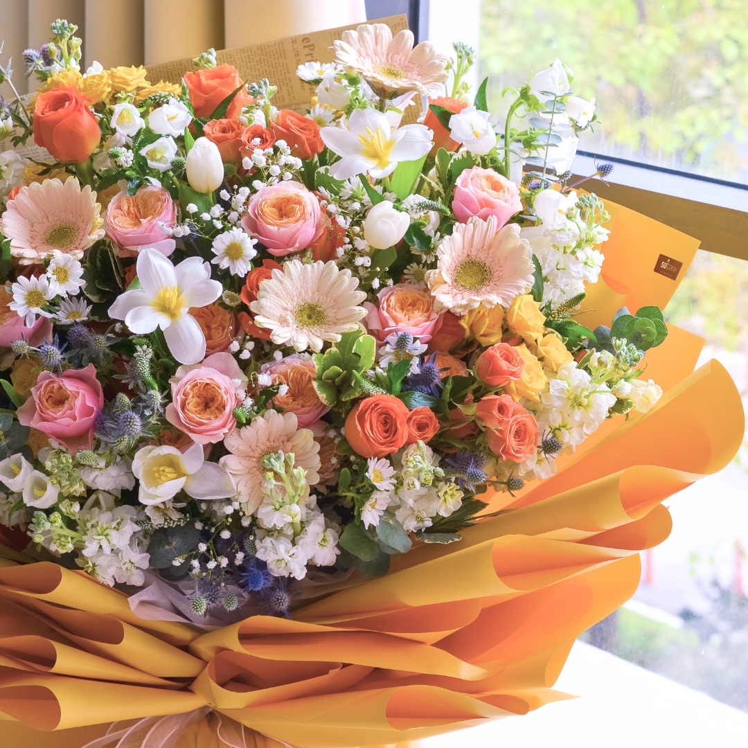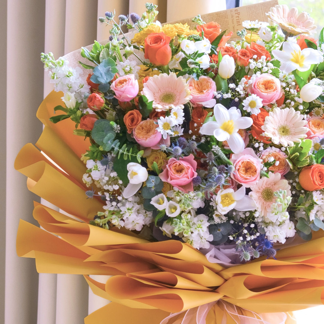 The “Sovereign Charm Hand Bouquet” is a vibrant and captivating arrangement that combines bold orange roses with soft pink roses and crisp white tulips. Accented by cheerful champagne daisies, mini orange roses, and delicate white matthiola, this bouquet also features the lightness of baby’s breath and the sunny touch of yellow mini roses. It embodies a blend of elegance and joy, making it perfect for celebrating special moments with a touch of royal charm. 🌹🌷🌼🤍
