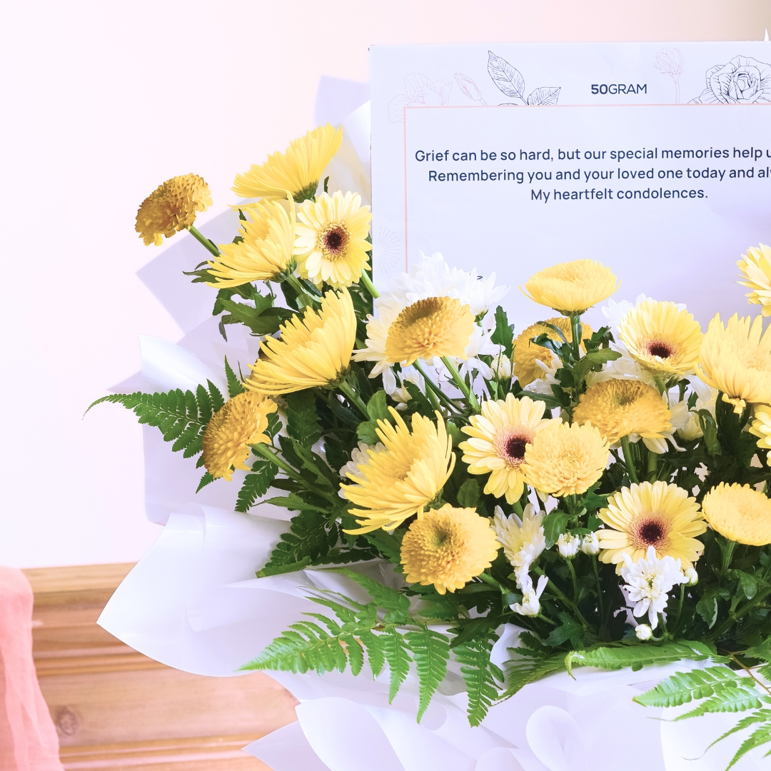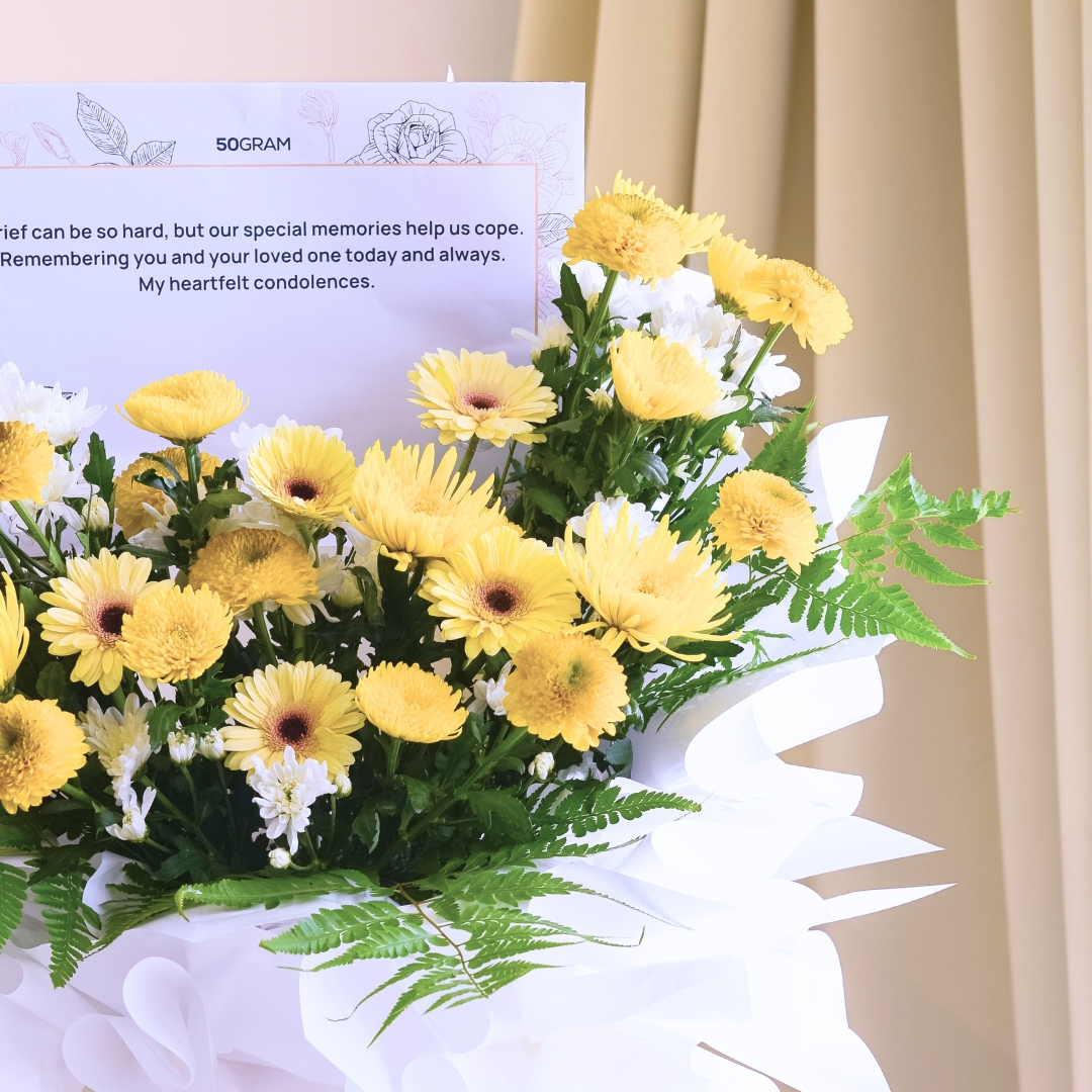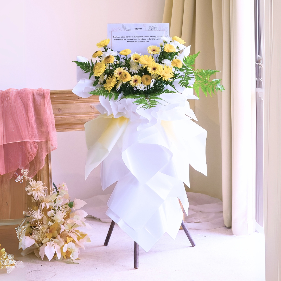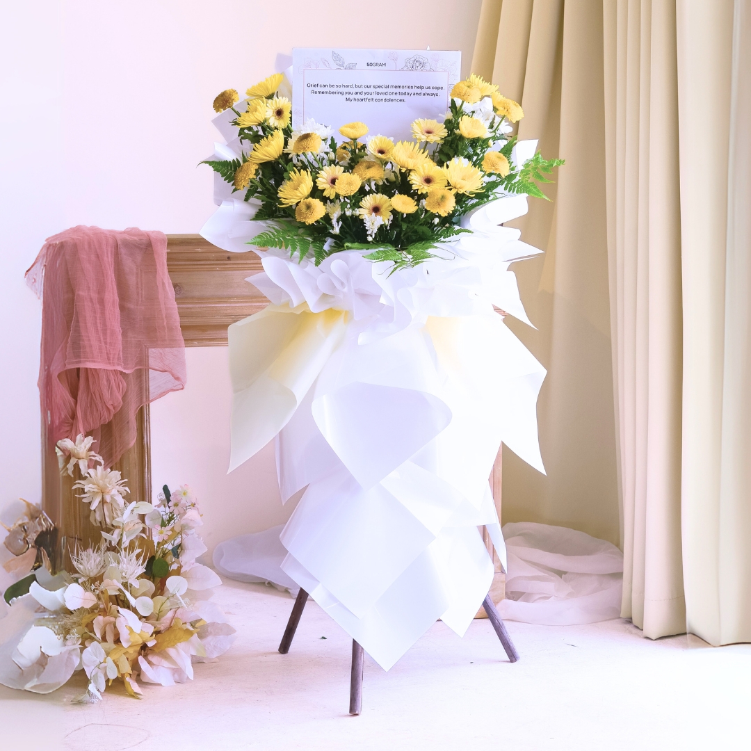 Embrace the warmth of our yellow-themed condolences stand flower elegantly wrapped in a dress wrapping paper. This arrangement showcases the delicate beauty of pom pom white flowers, accompanied by the vibrant hues of yellow and red ping ping blooms. Enhanced by the gentle presence of yellow net mums, paku leaves, and rainforest leaves, it creates a serene and comforting tribute that brings solace and light during moments of condolences.