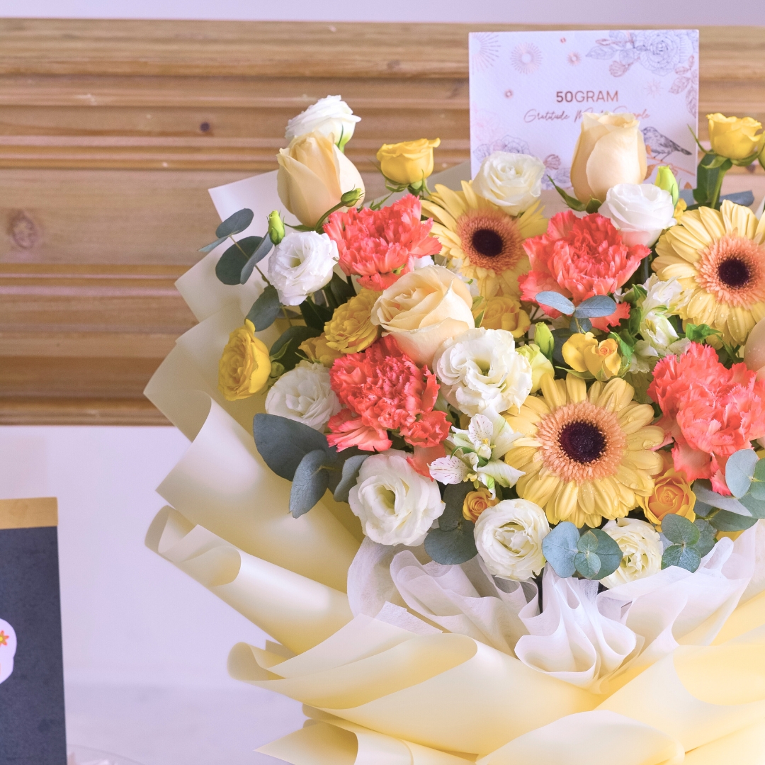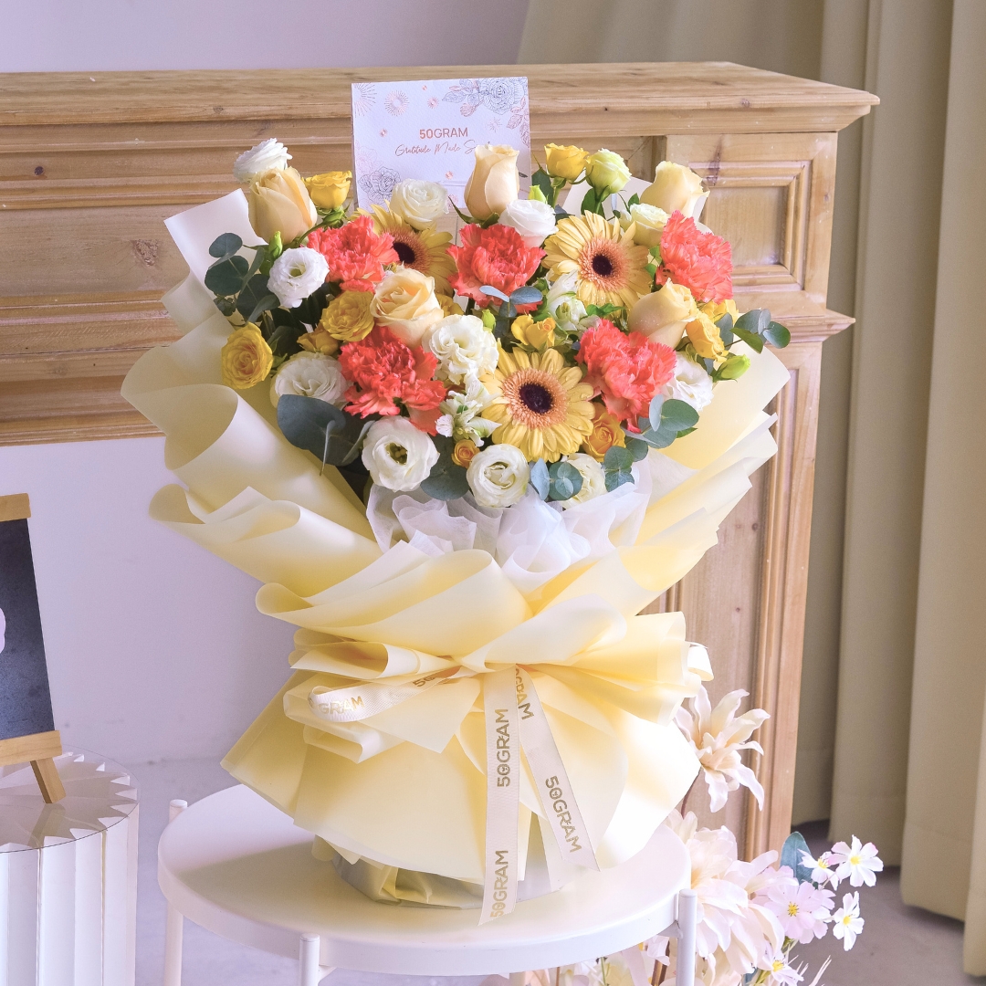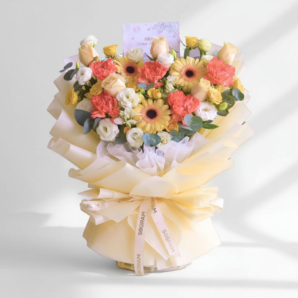 This bouquet comes with Champagne Daisy x 3 , Champagne Rose x 5, Orange Carnation x 5, Yellow Spray Rose, White Eustoma, White Alstroemeria & Eucalyptus.