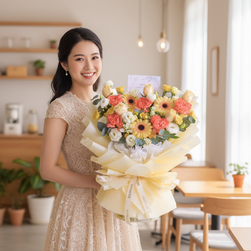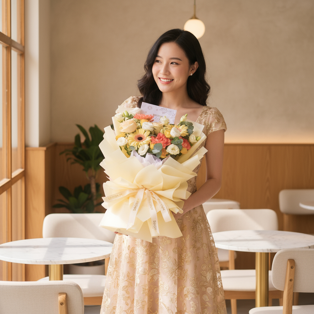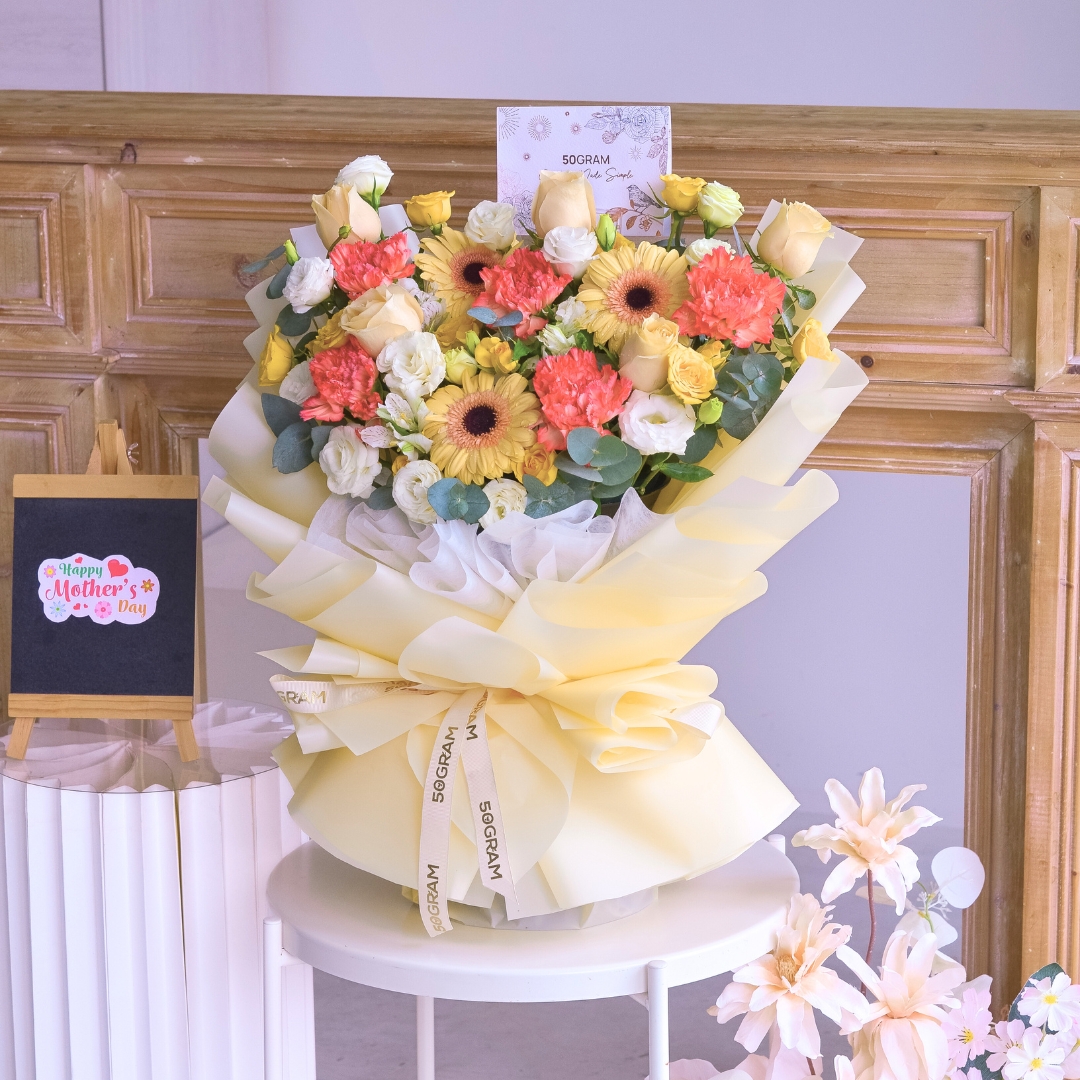 This bouquet comes with Champagne Daisy x 3 , Champagne Rose x 5, Orange Carnation x 5, Yellow Spray Rose, White Eustoma, White Alstroemeria & Eucalyptus.
