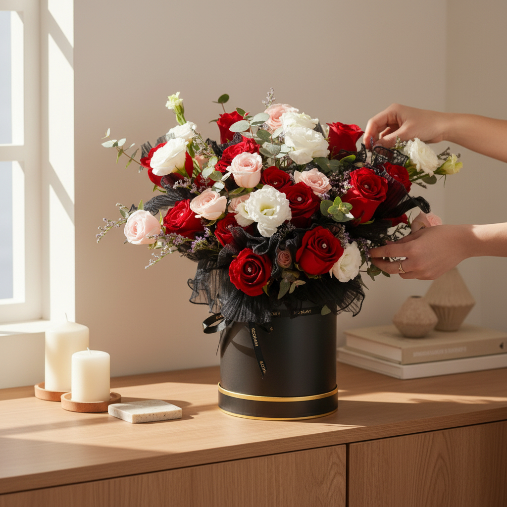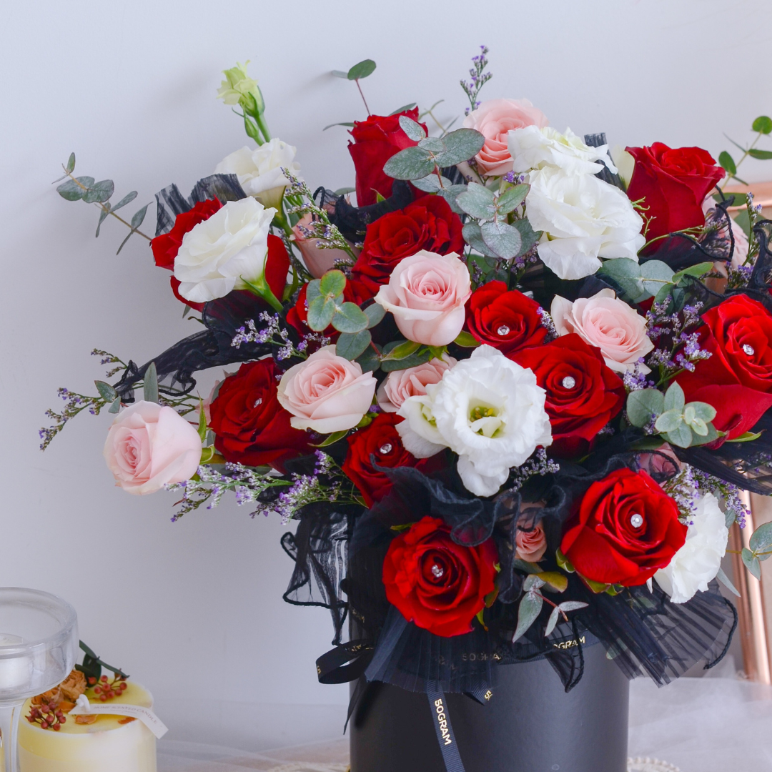 Introducing “The Sweet Monica”, a black, classic and elegant flower box that is perfect for Valentine’s Day. This box features an eye-catching combination of Red Roses, Eustoma, and Spray Pink Roses. The red roses symbolize love, passion, and desire, while the Eustoma adds a touch of sophistication and elegance. The Spray Pink Roses bring in a touch of softness and delicacy to the bouquet.