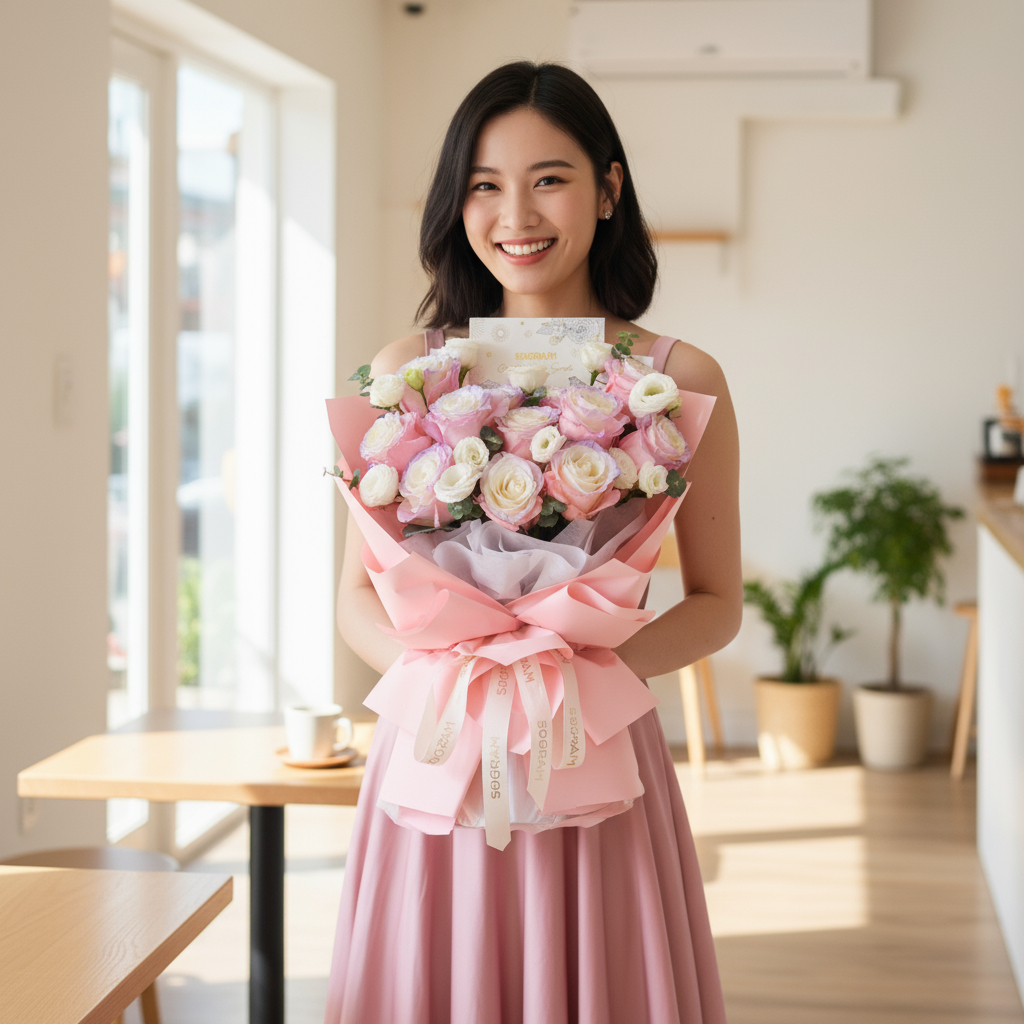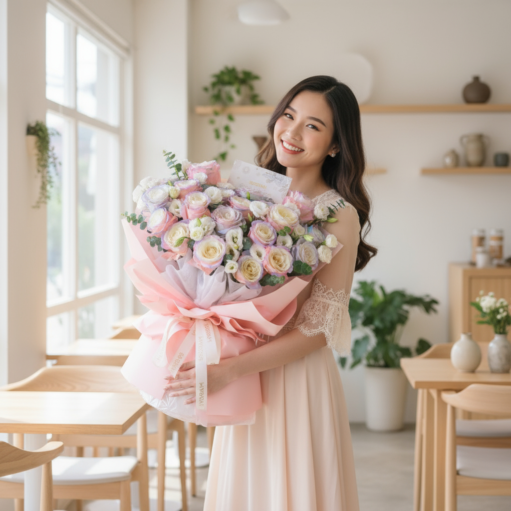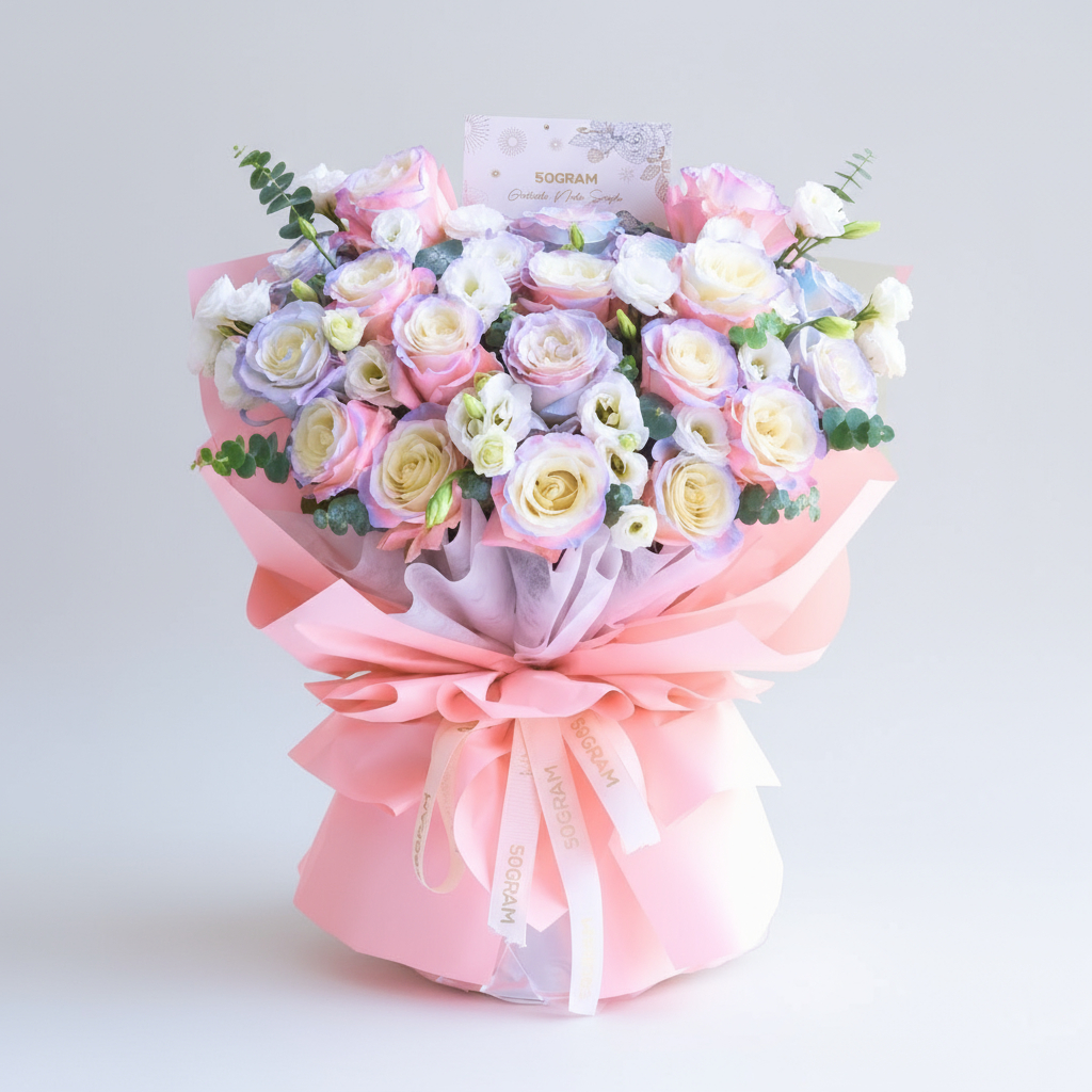 The soft pink hues of the aurora roses symbolize affection, gratitude, and compassion, reflecting the sincerity of the promises exchanged between individuals. The delicate blue tones represent tranquility and trust, portraying the sense of security that comes with a true promise.
