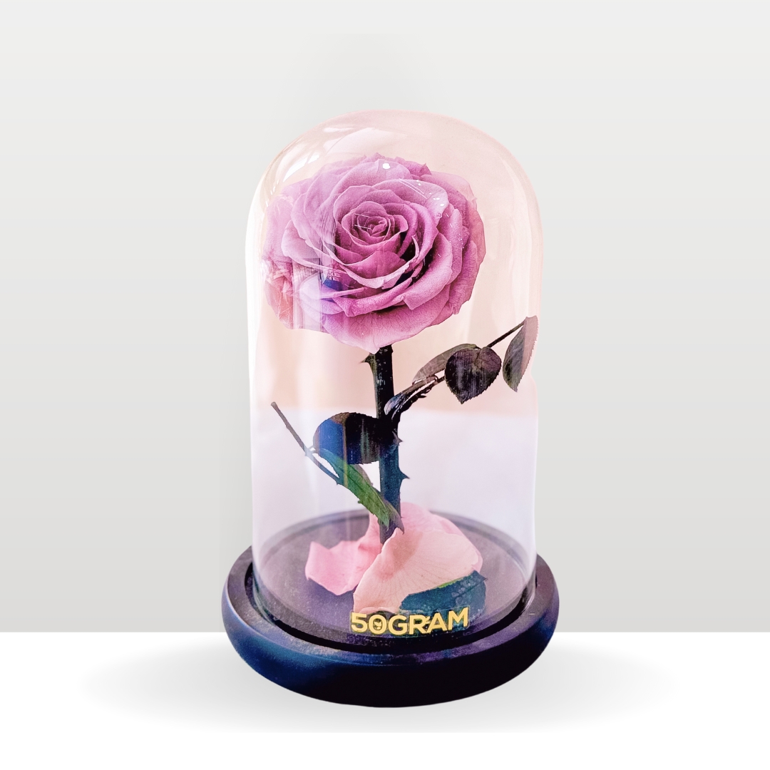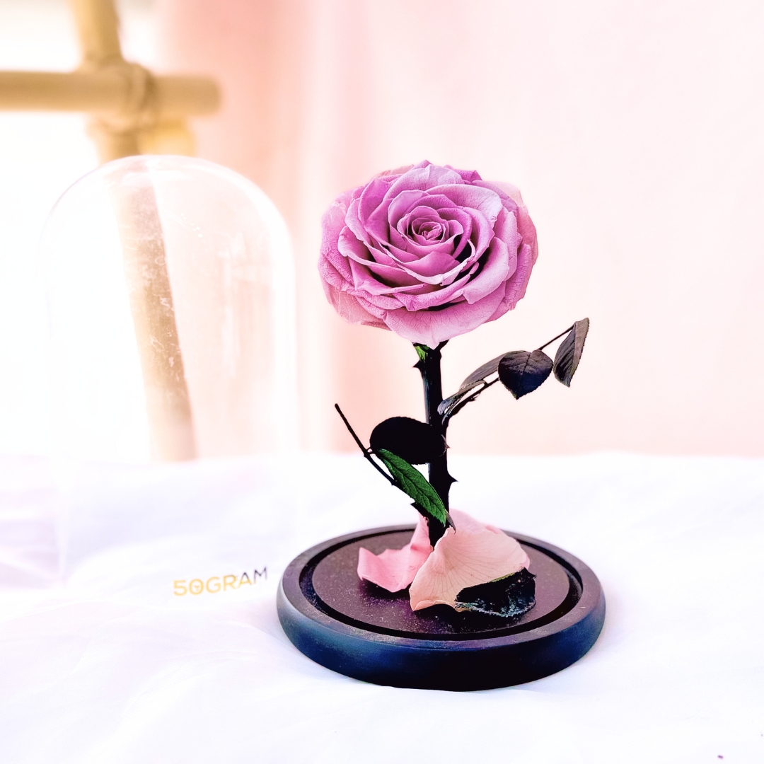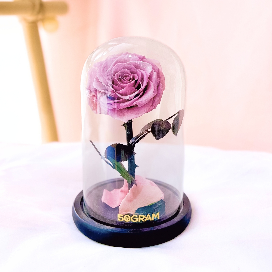 Encased in a crystal-clear dome, a luxurious preserved purple rose stands proudly, surrounded by delicate purple petals, creating an enchanting, almost magical aura. The rich purple hue symbolizes nobility, mystery, and everlasting love, making it a meaningful gift or a statement decor piece.