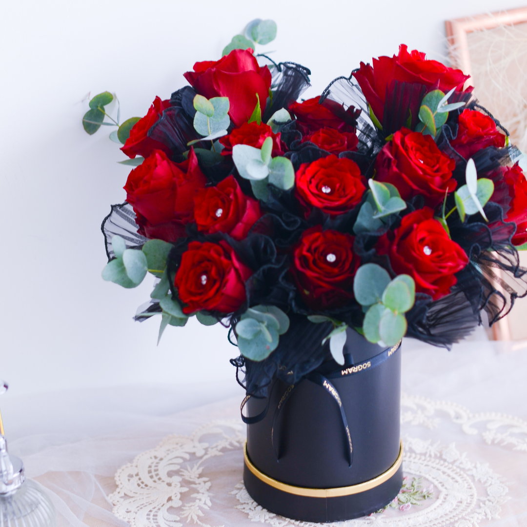 They are introducing “The Crimson Lace Valentine Flower Box”, a black, classic, and elegant flower box perfect for Valentine’s Day. This box features a striking arrangement of Red Roses, carefully wrapped with black lace to create a simple and classic look. The red roses symbolize love, passion, and desire, while the black lace adds a touch of elegance and sophistication.