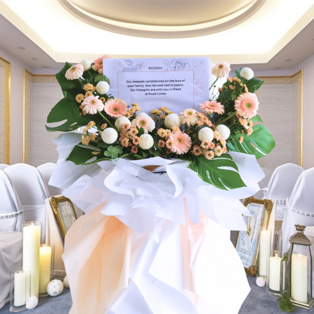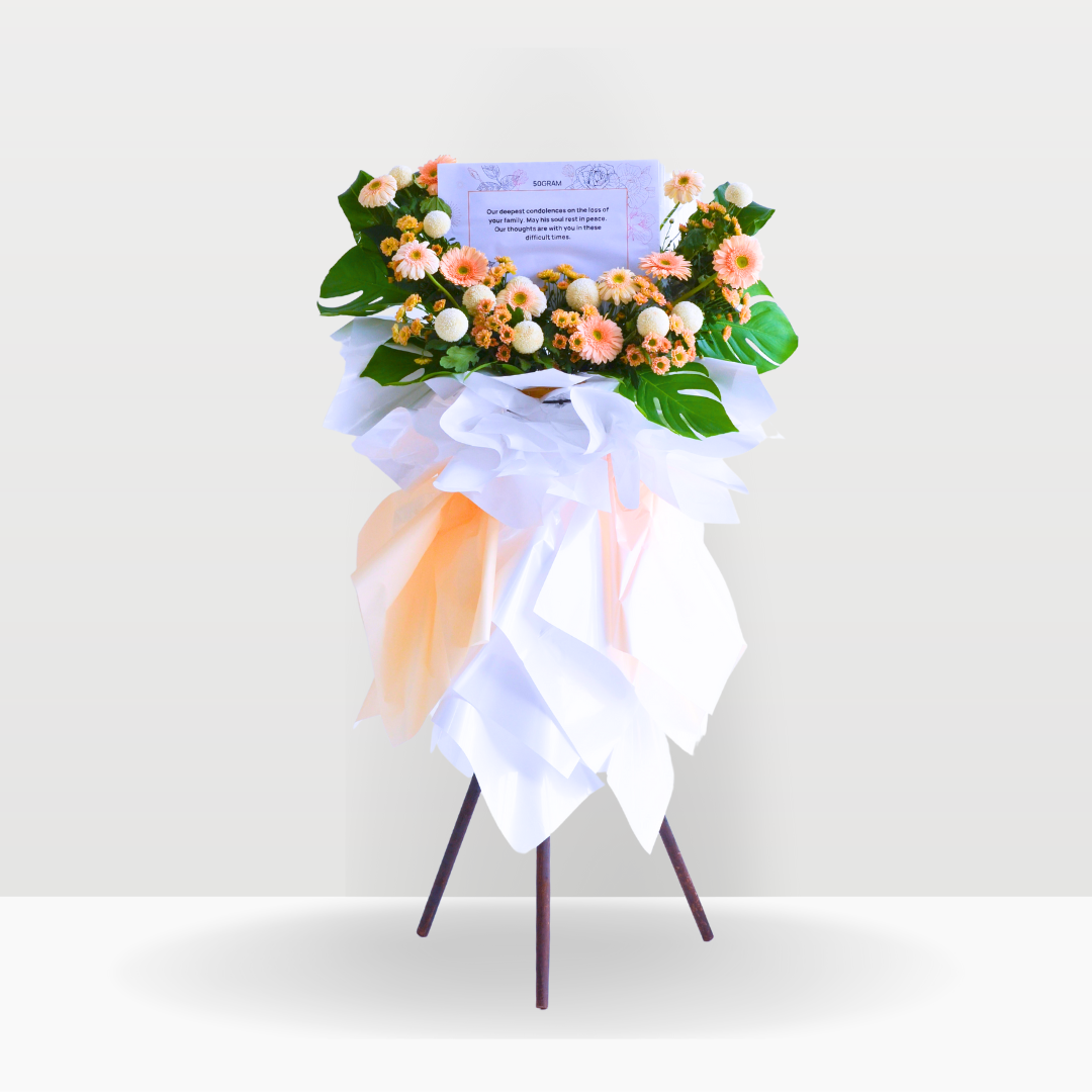 Offer solace and compassion with our heartfelt condolences stand flower. This arrangement beautifully combines delicate white ping pong flowers, soothing peach gerbera, and gentle champagne pom poms, complemented by the elegance of monstera and Renaissance leaves. Wrapped in a tasteful dress wrapping paper, this arrangement conveys warmth and comfort during loss, expressing your heartfelt condolences with grace and sincerity.