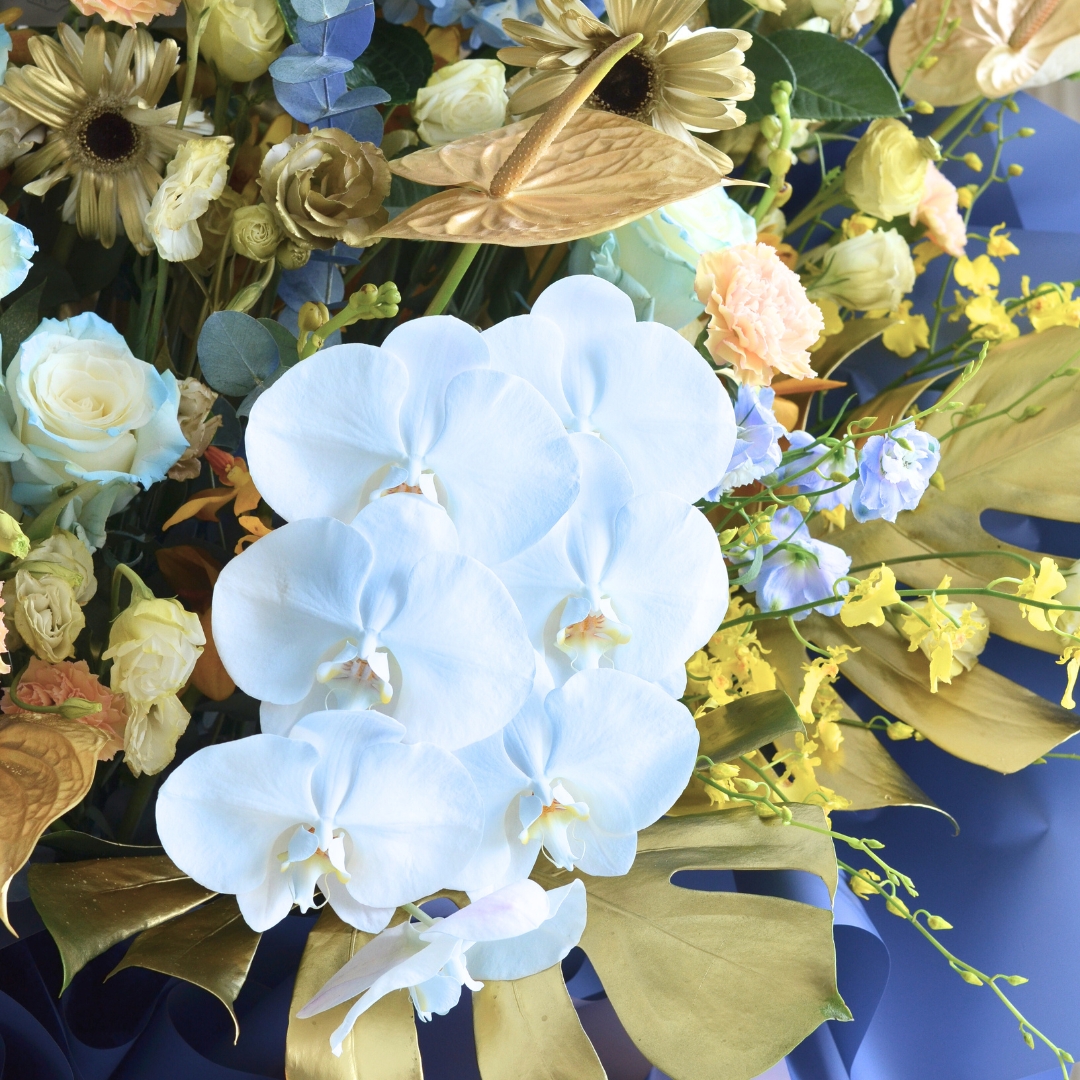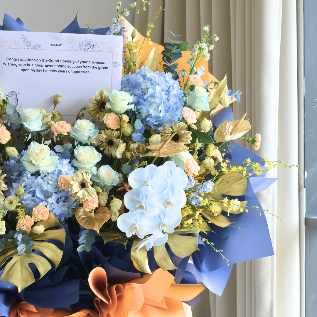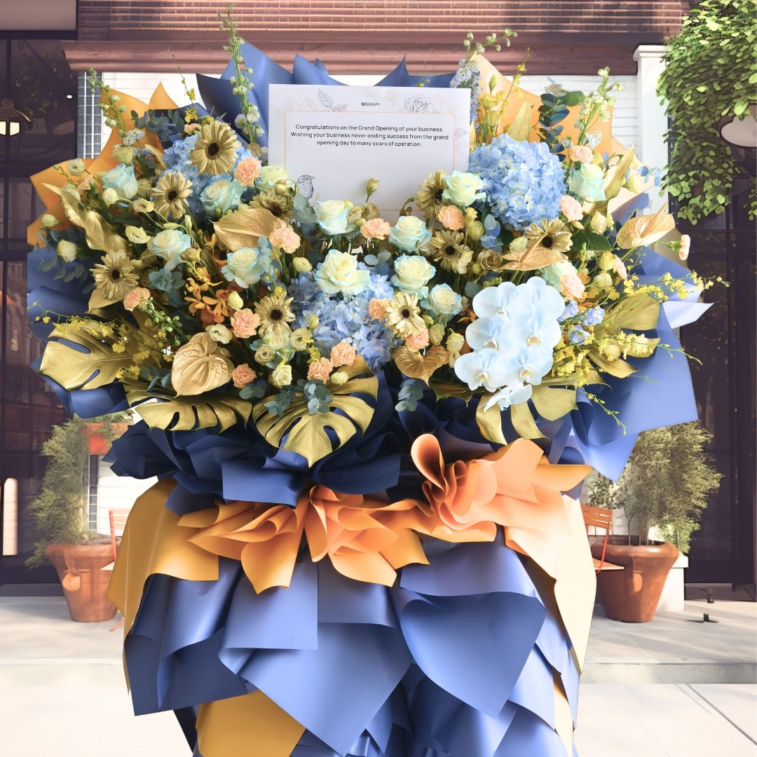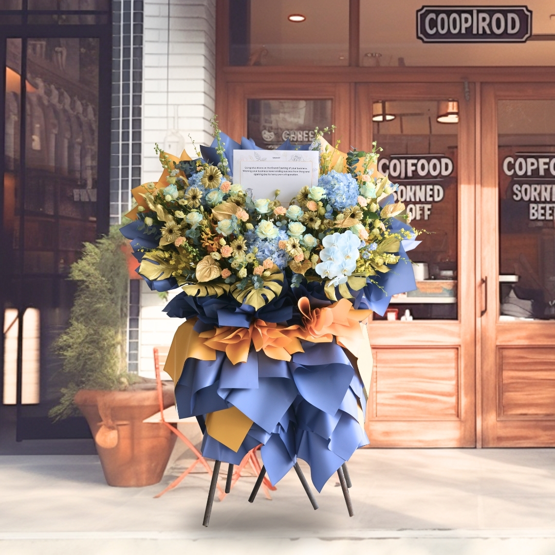 The Triumphant Dawn Business Opening Stand (Premium Selection) is a stunning display of elegance and success, featuring a captivating combination of blue roses, white daisies, and blue hydrangeas to symbolize growth and opportunity. Delicate anthuriums and striking blue delphiniums add a touch of modern sophistication, while vibrant yellow orchids and two-tone yellow carnations bring warmth and energy to the arrangement. Phalaenopsis orchids and rich foliage, complemented by eucalyptus, complete the design. This grand floral stand radiates triumph and new beginnings, perfect for celebrating a prosperous business opening. πŸŒΏπŸ’™πŸŒΌ