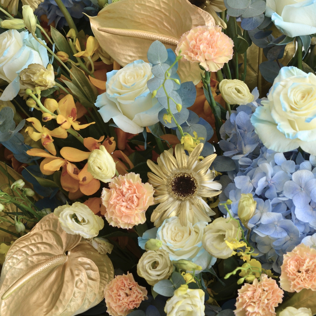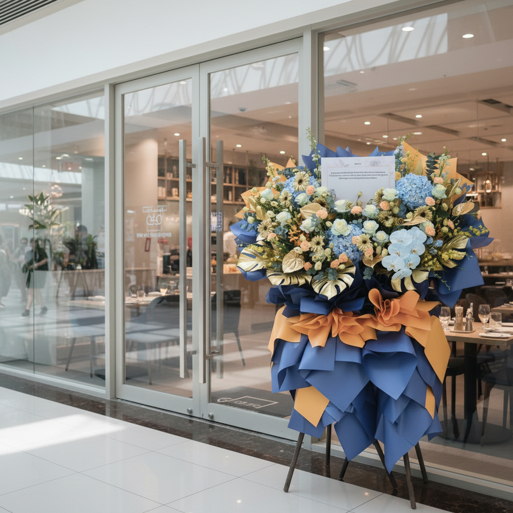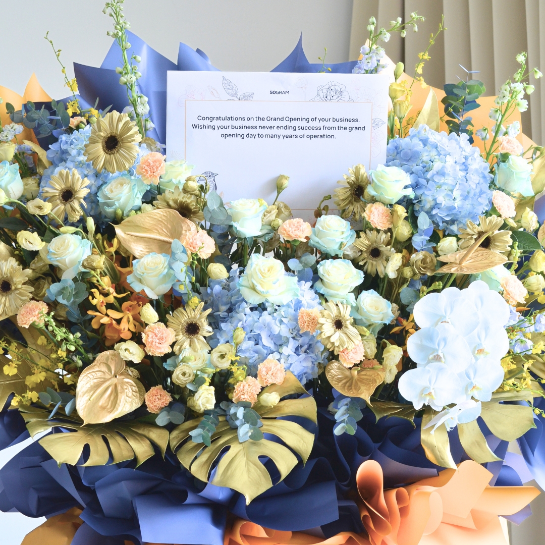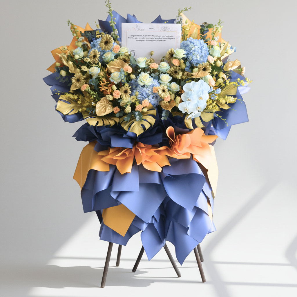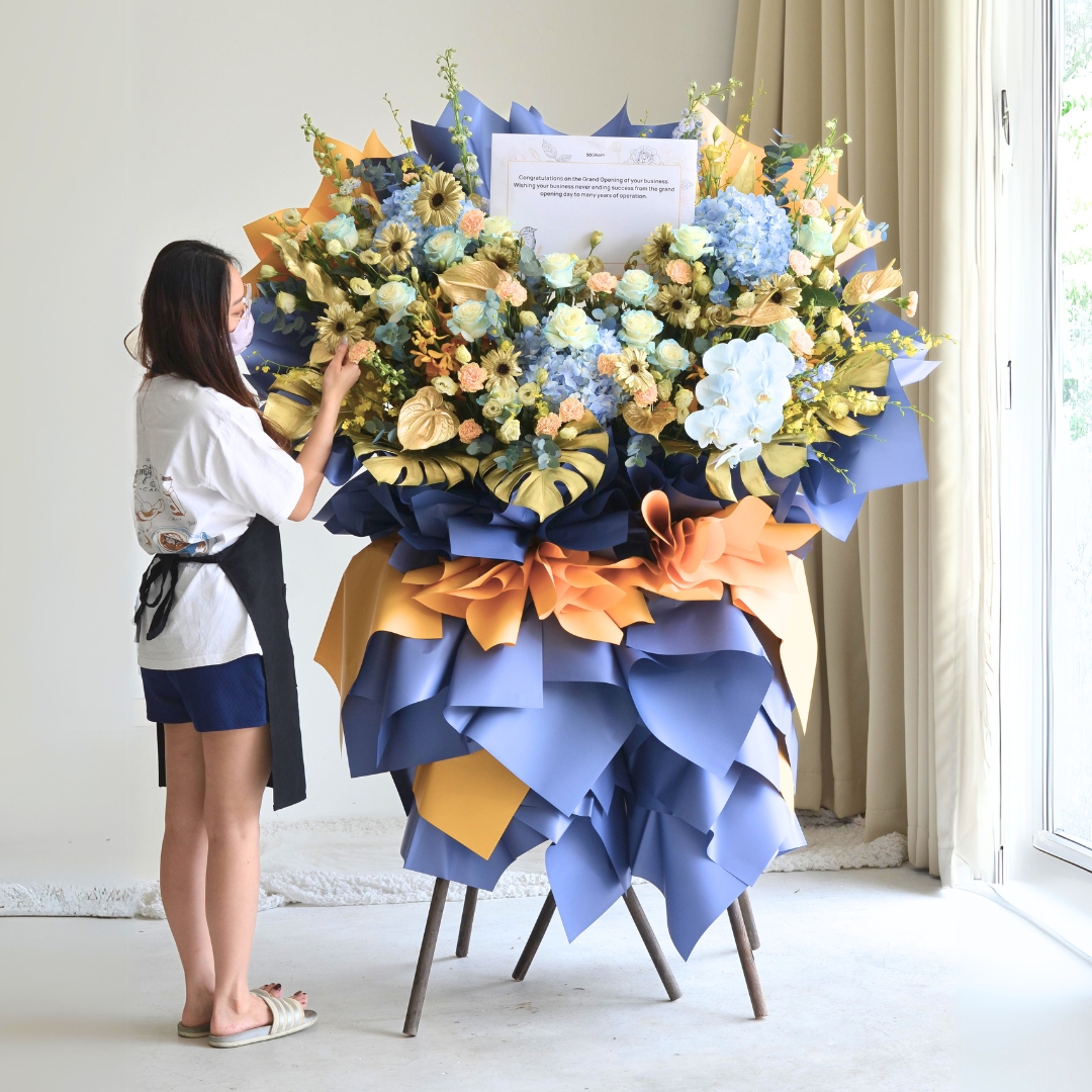 The Triumphant Dawn Business Opening Stand (Premium Selection) is a stunning display of elegance and success, featuring a captivating combination of blue roses, white daisies, and blue hydrangeas to symbolize growth and opportunity. Delicate anthuriums and striking blue delphiniums add a touch of modern sophistication, while vibrant yellow orchids and two-tone yellow carnations bring warmth and energy to the arrangement. Phalaenopsis orchids and rich foliage, complemented by eucalyptus, complete the design. This grand floral stand radiates triumph and new beginnings, perfect for celebrating a prosperous business opening. πŸŒΏπŸ’™πŸŒΌ