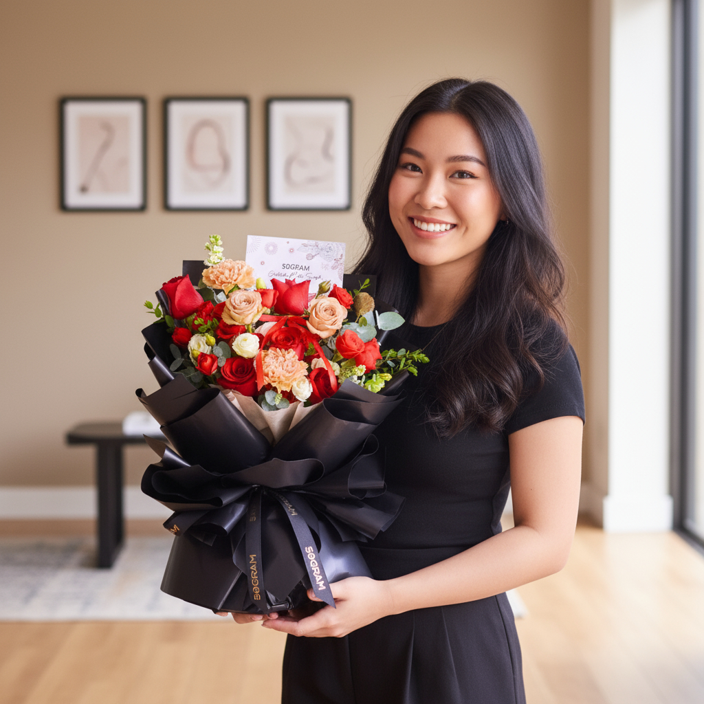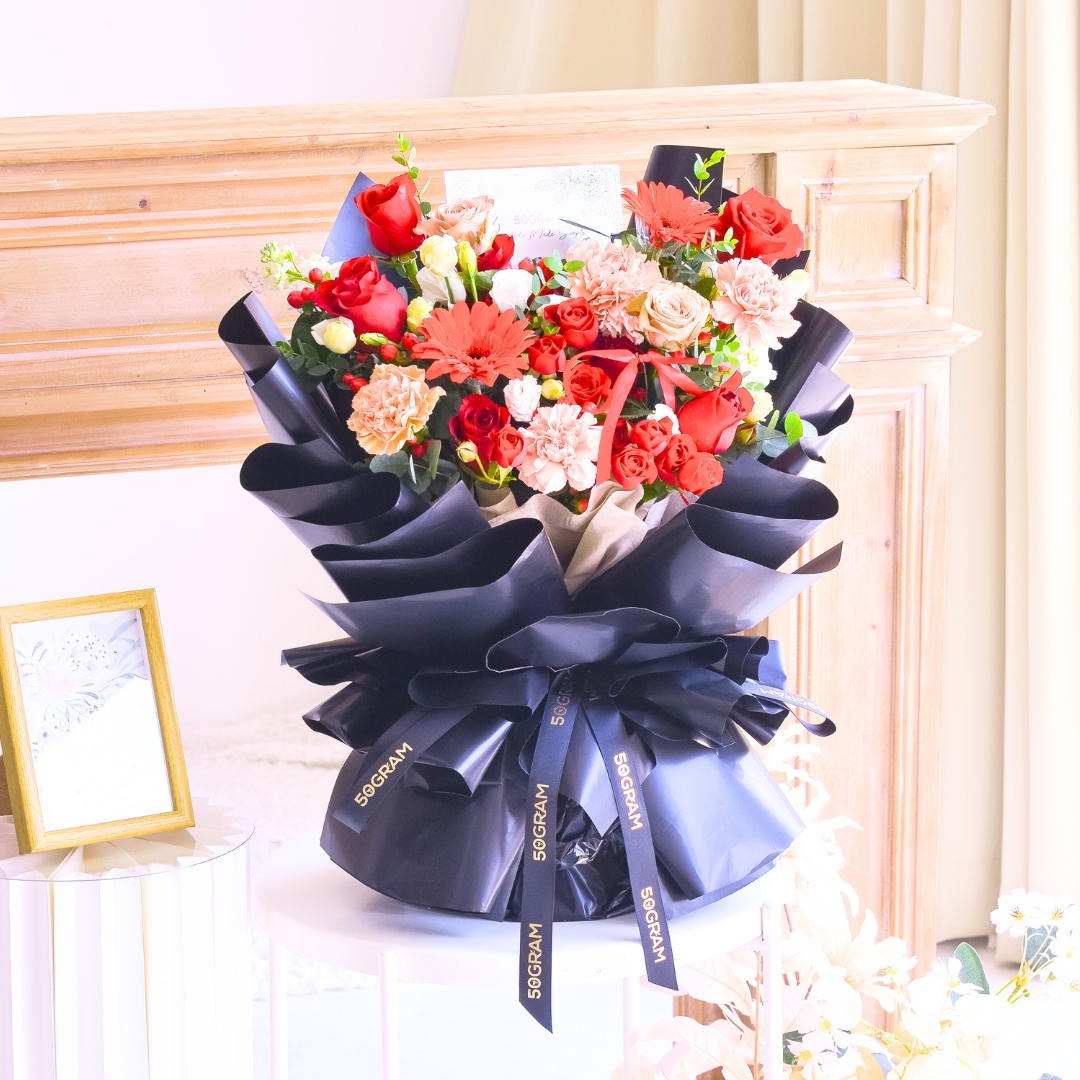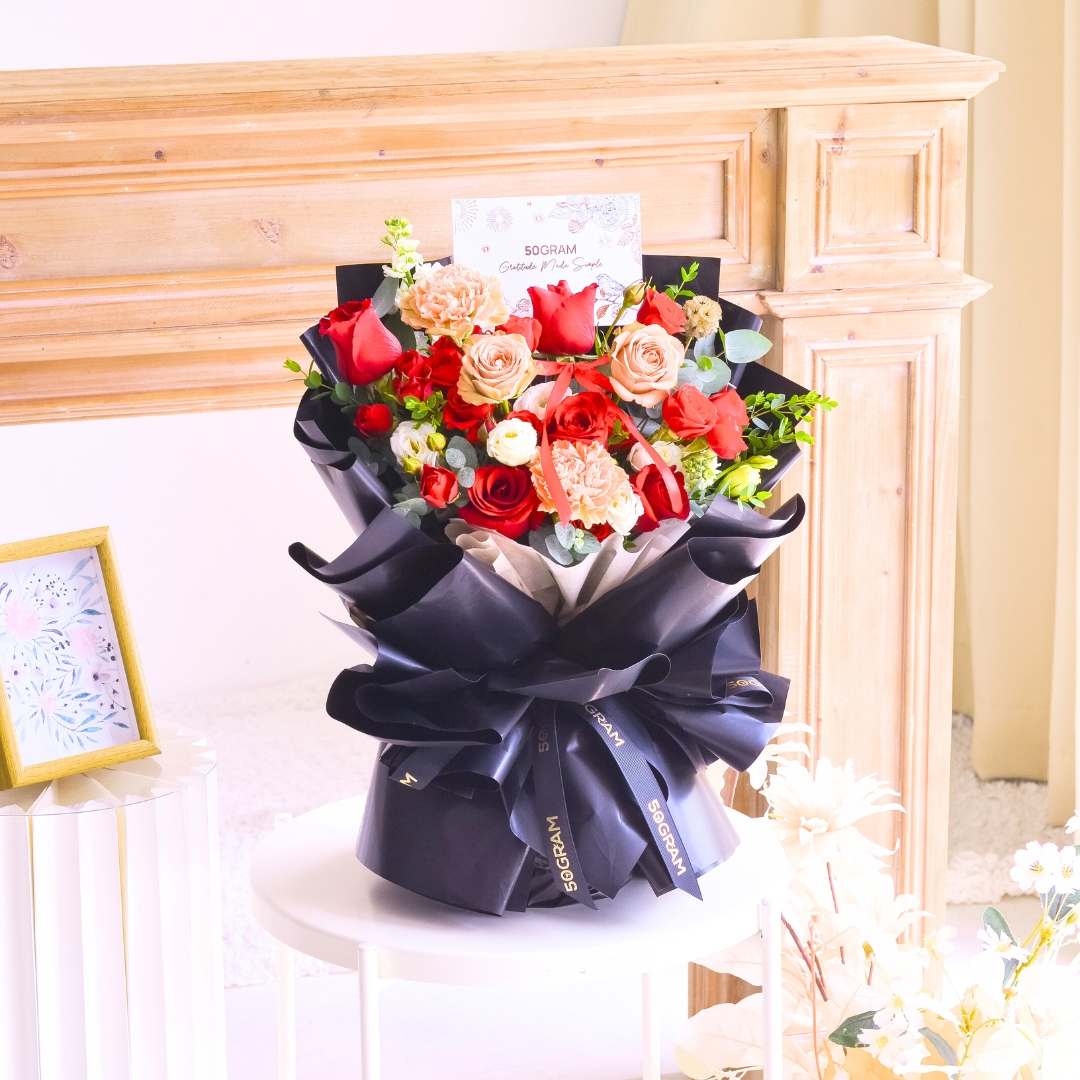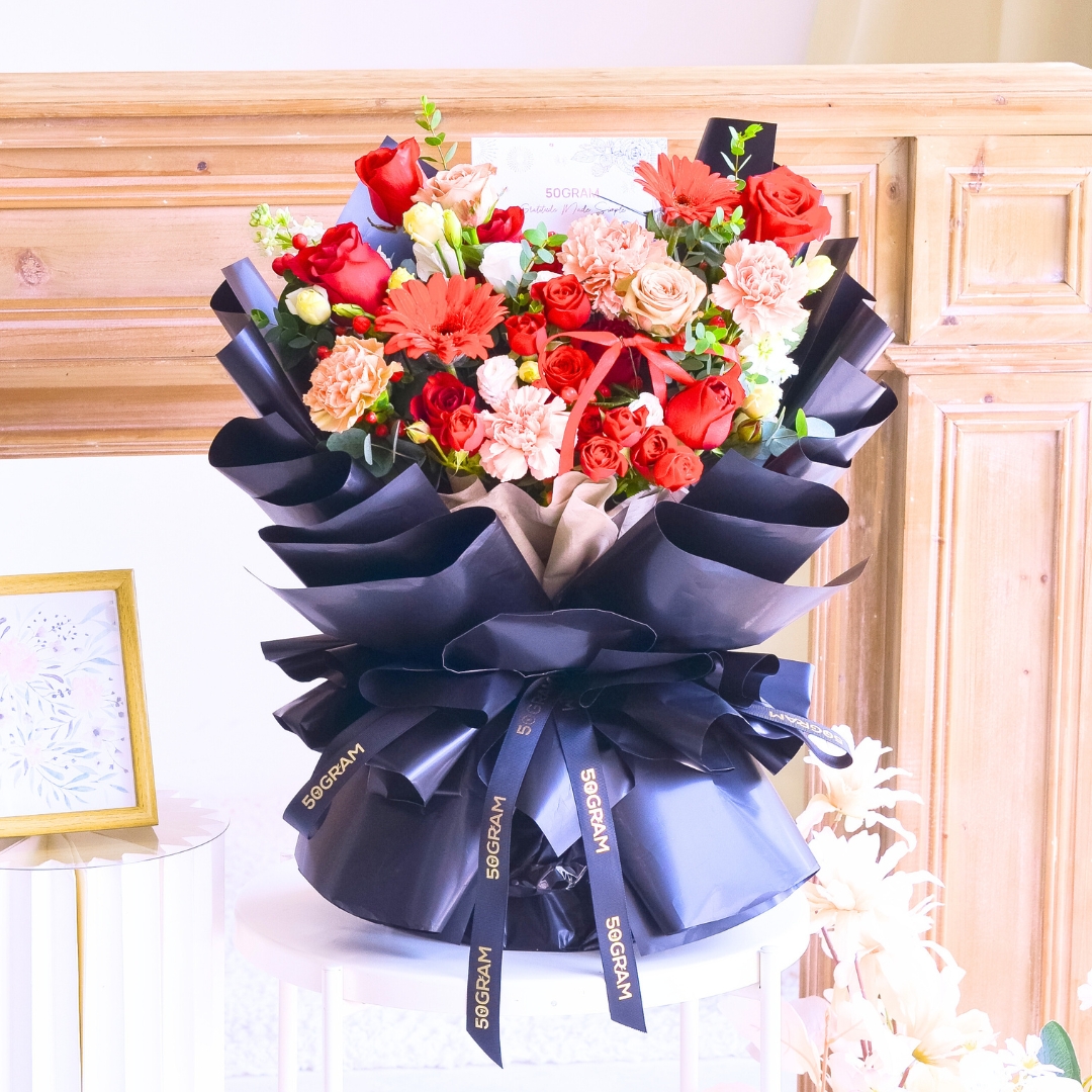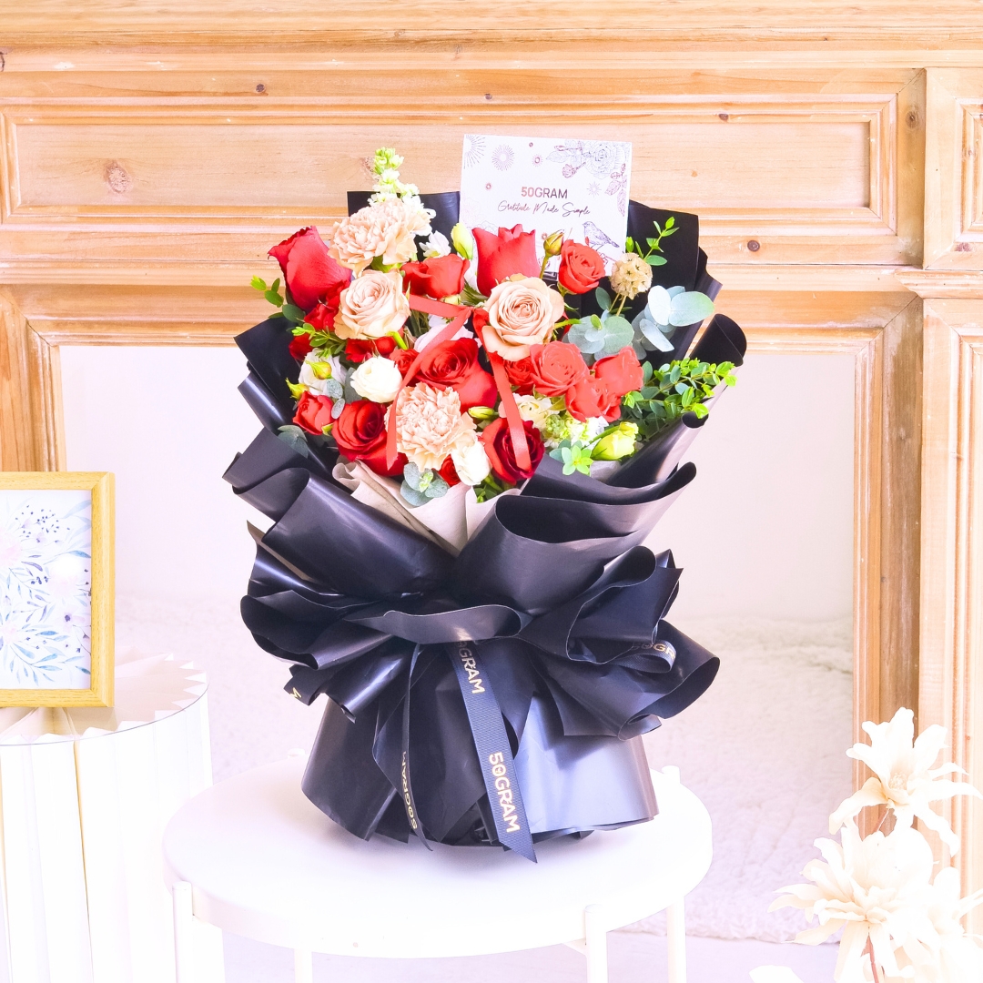 The Medium size bouquet comes with Red Rose x 5, Cappuccinno Rose x 2, Brut Carnation x 2, Spray Rose Red, Scabiosa Brown, White Eustoma, Matthiola White & Eucalyptus