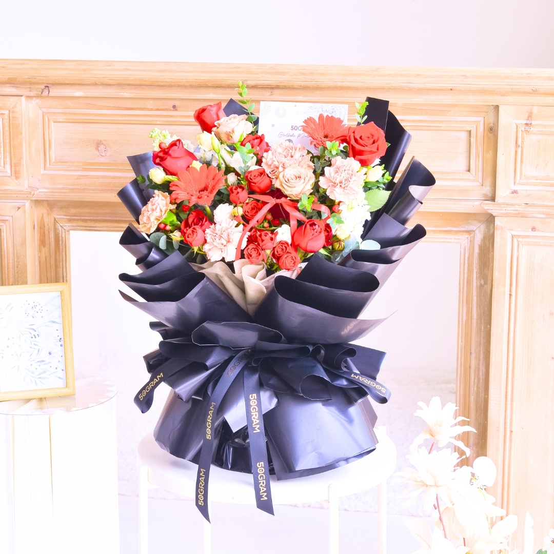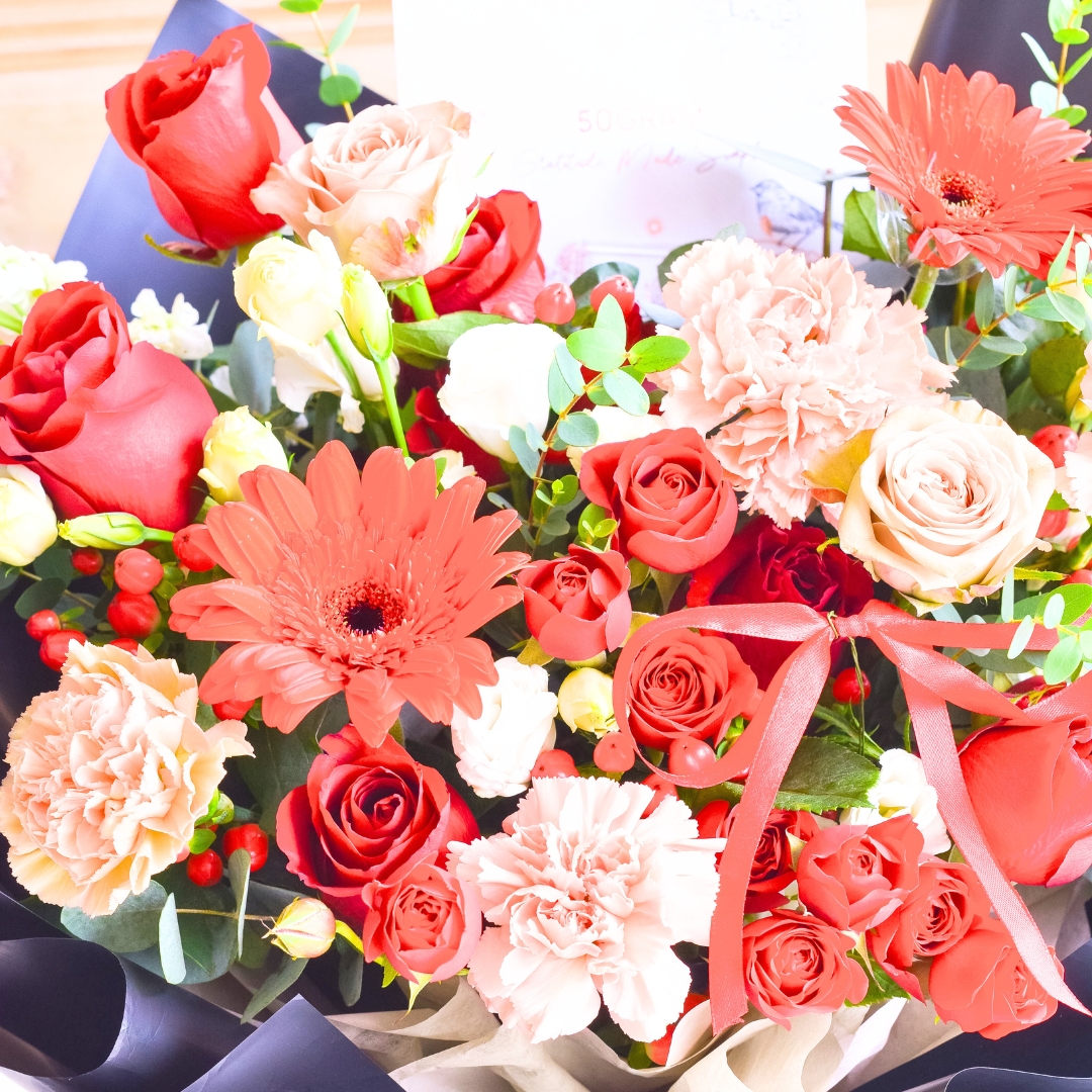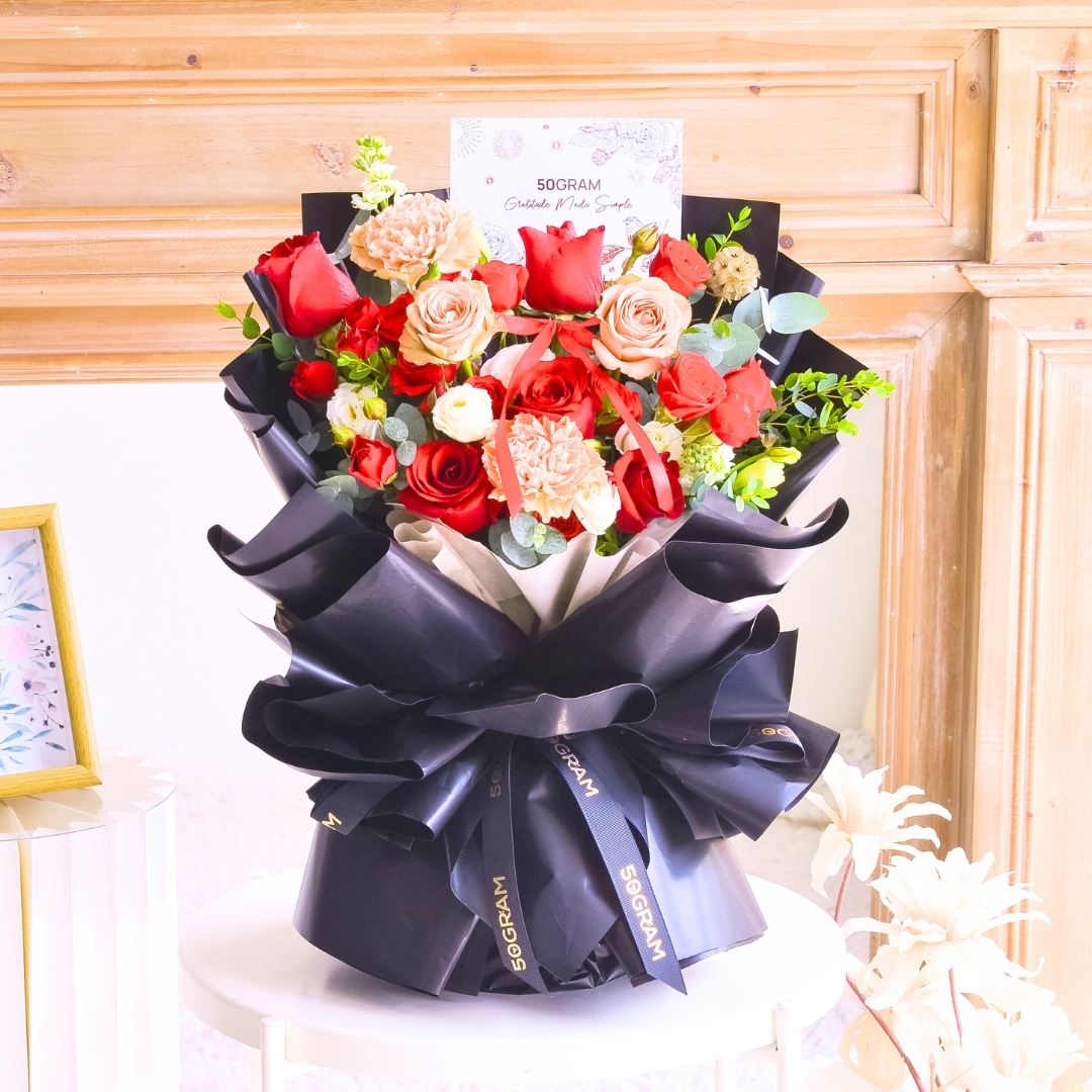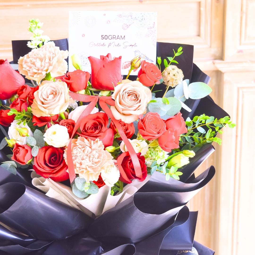 The Large size bouquet comes with Red Rose x 8, Cappuccinno Rose x 2, Red Daisy x 2, Brut Carnation x 4, Spray Rose Red, Red Berry, White Eustoma, Matthiola White & Eucalyptus
