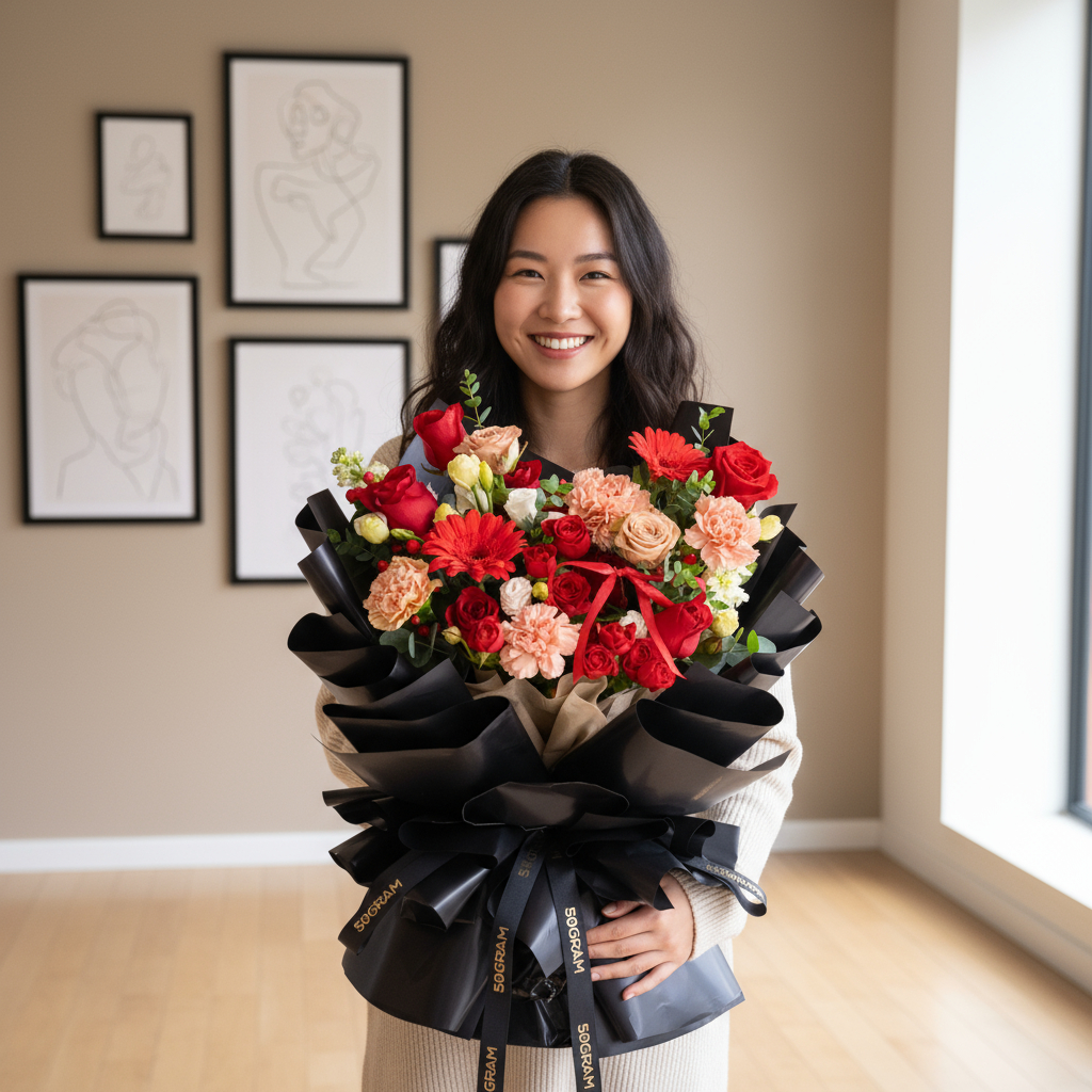 The True Love Bloom Hand Bouquet exudes passion and elegance, blending bold red hues with soft neutrals. Featuring striking red roses and daisies, alongside unique cappuccino roses and brut carnations, this bouquet symbolizes deep and timeless love. Accented by red spray roses, red berries, and the delicate touch of white eustomas and matthiola, this stunning arrangement is completed with fresh eucalyptus for a touch of greenery. Wrapped in sleek black, it’s the perfect statement of true love this Special Day. 🌹❤️