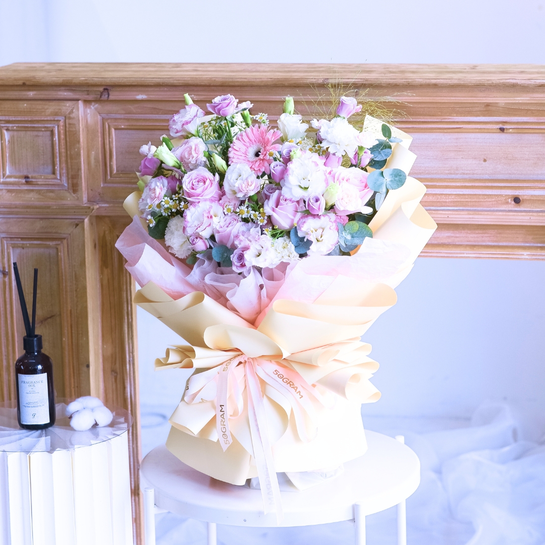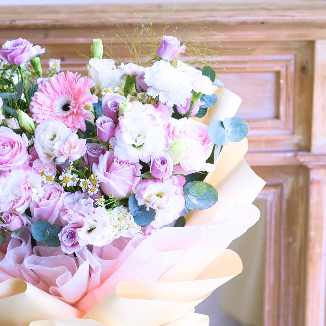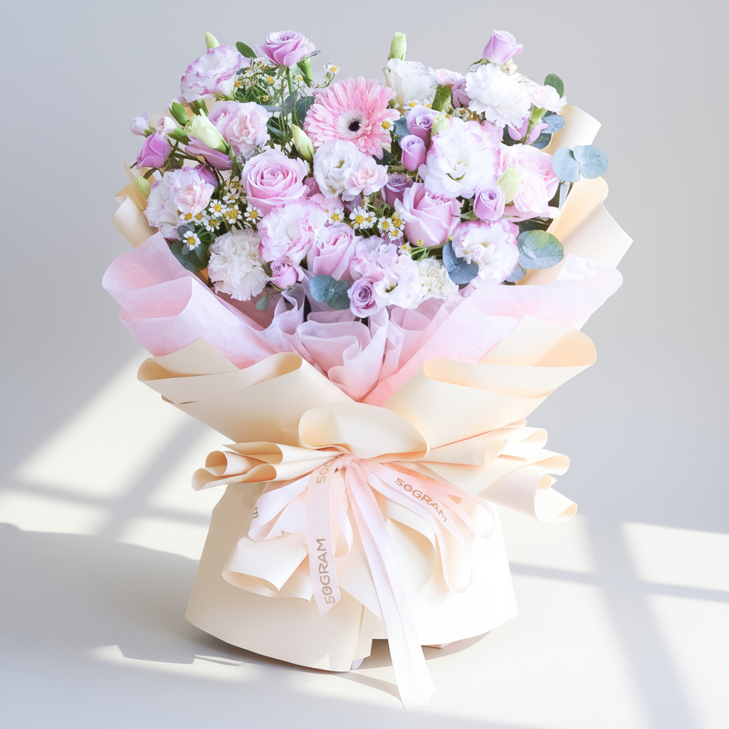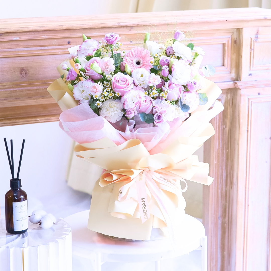 At the center, pink gerberas and roses bring softness and charm, paired with purple spray roses and two-tone pink eustoma for gentle contrast. Layers of spray pink carnations, white carnations, and cheerful chamomile create fullness and freshness, while fountain panicum and eucalyptus cineria add a feathery, natural finish.