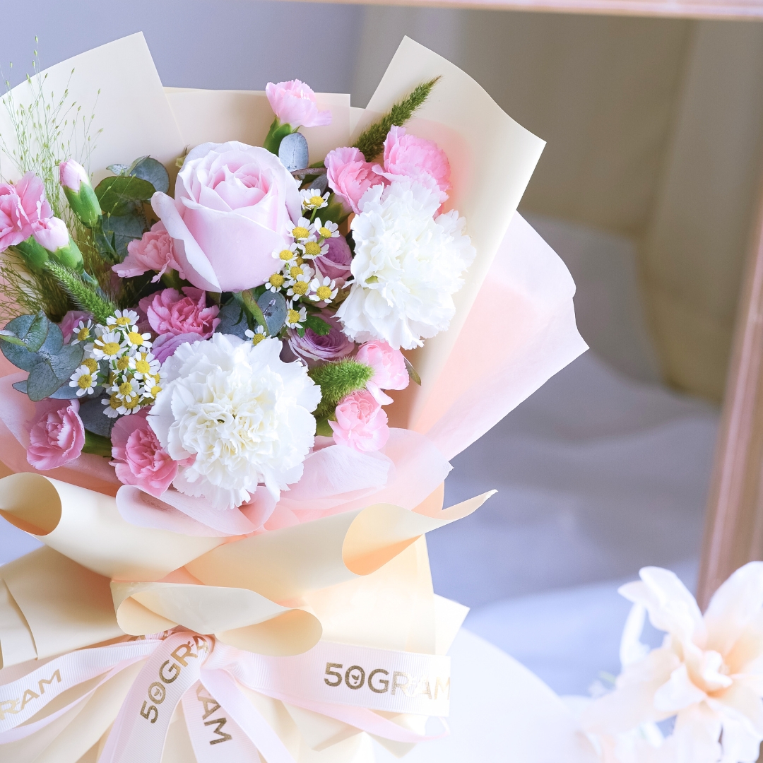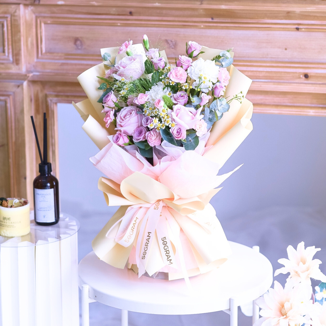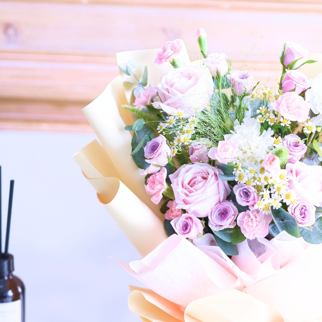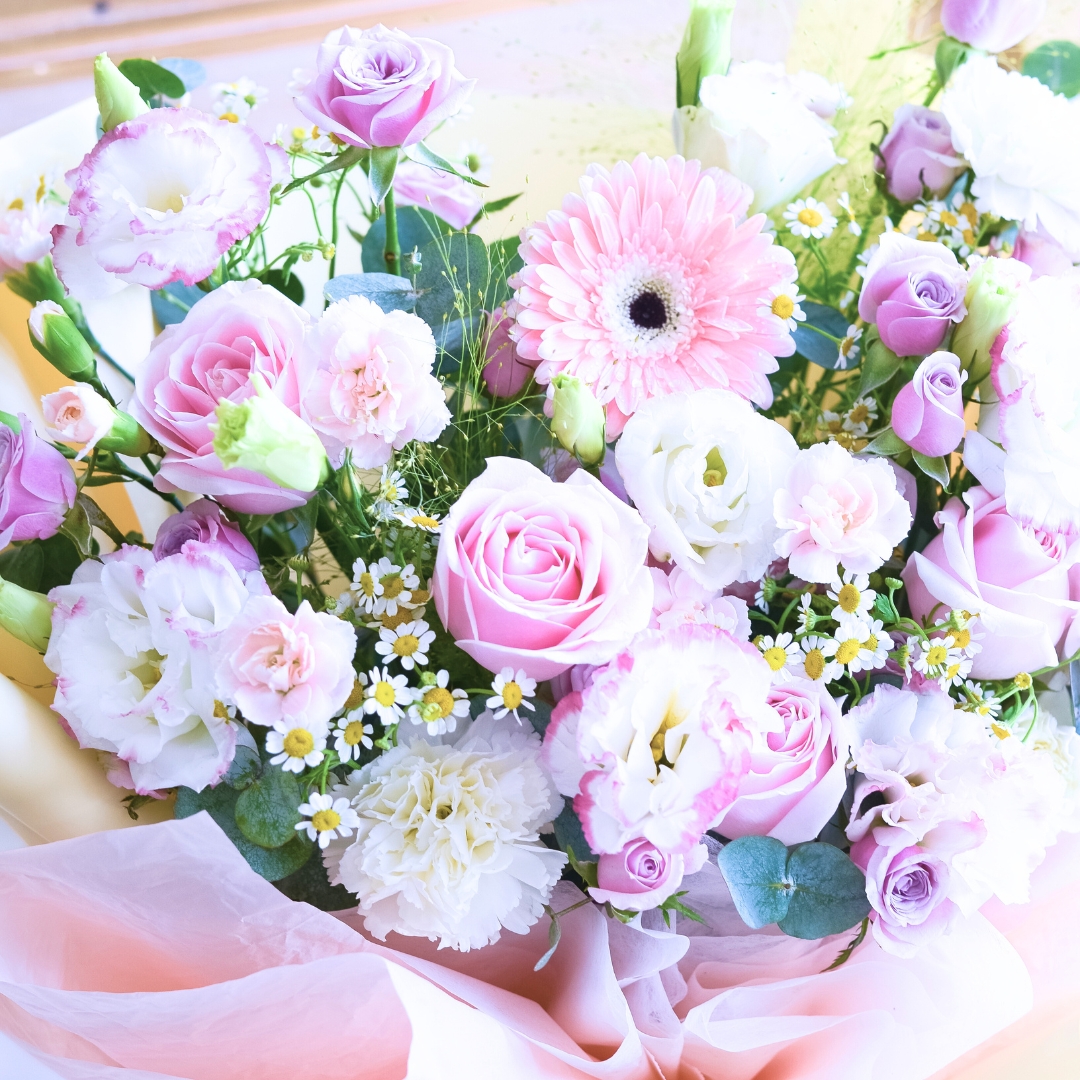 At the center, pink gerberas and roses bring softness and charm, paired with purple spray roses and two-tone pink eustoma for gentle contrast. Layers of spray pink carnations, white carnations, and cheerful chamomile create fullness and freshness, while fountain panicum and eucalyptus cineria add a feathery, natural finish.