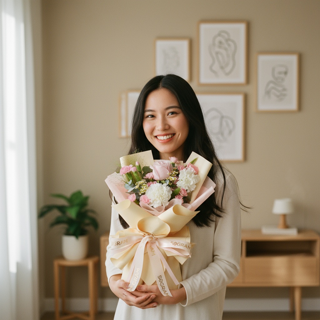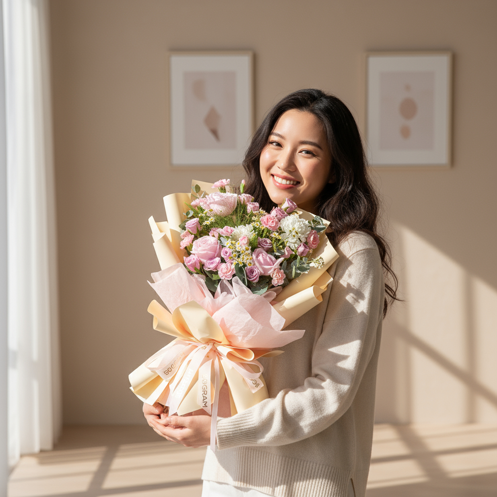 Softly romantic and effortlessly graceful, the Velvet Nude Hand Bouquet is a delicate composition of blush tones and airy textures. This bouquet blends classic femininity with modern elegance, making it an ideal choice for birthdays, anniversaries, or simply expressing affection with warmth and style.