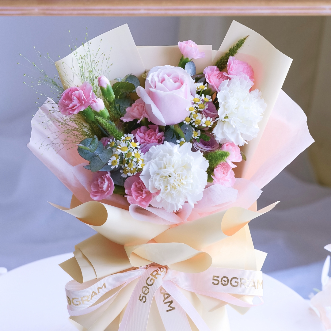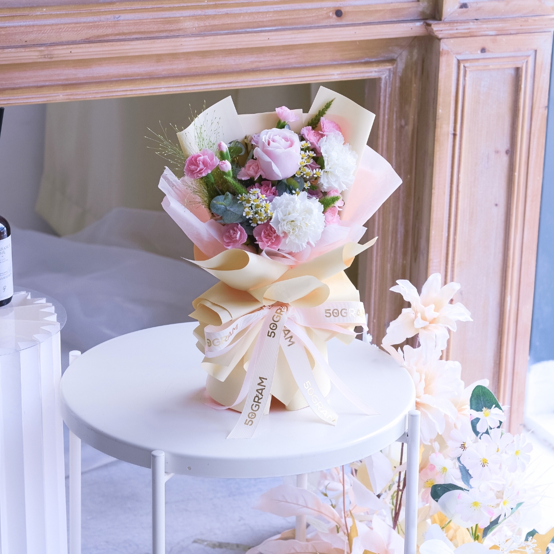 The Medium size comes with Pink Rose x 3, White Carnation x 2, Spray Rose Purple, Chamomile, Spray Carnation Pink, Eustoma 2 Tone Pink, Fountain Panicum, Cat Tail & Eucalyptus.