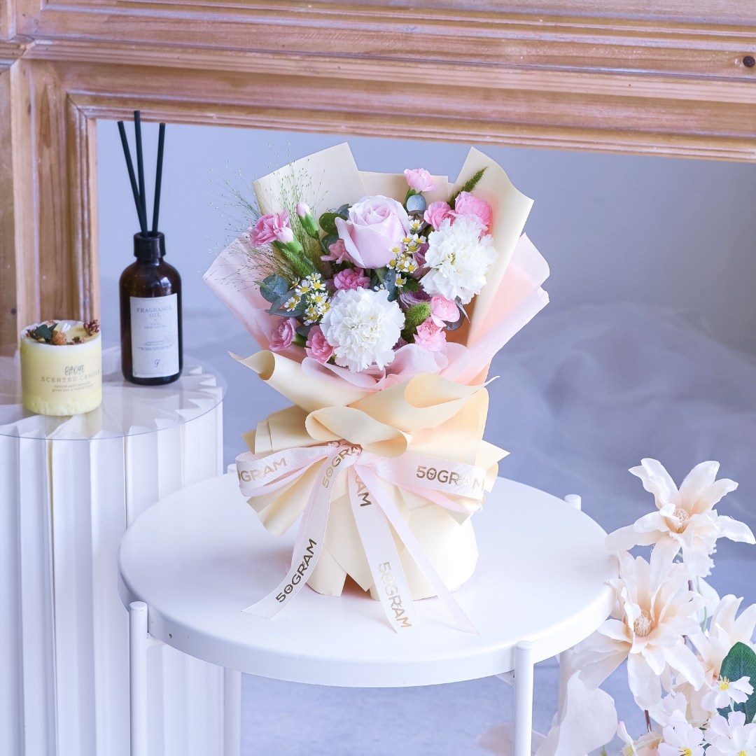 The Regular size comes with Pink Rose x 1, White Carnation x 2, Spray Rose Purple, Chamomile, Spray Carnation Pink, Eustoma 2 Tone Pink, Fountain Panicum, Cat Tail & Eucalyptus.