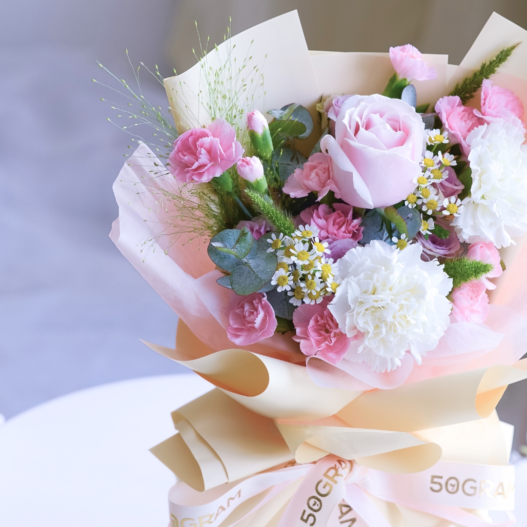 The Large size comes with Gerbera Pink x 1, Pink Rose x 5, White Carnation x 3, Spray Rose Purple, Chamomile, Spray Carnation Pink, Eustoma 2 Tone Pink, Fountain Panicum & Eucalyptus.