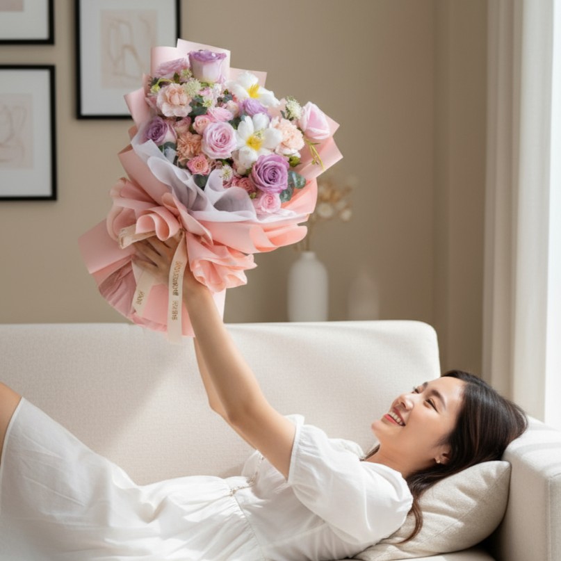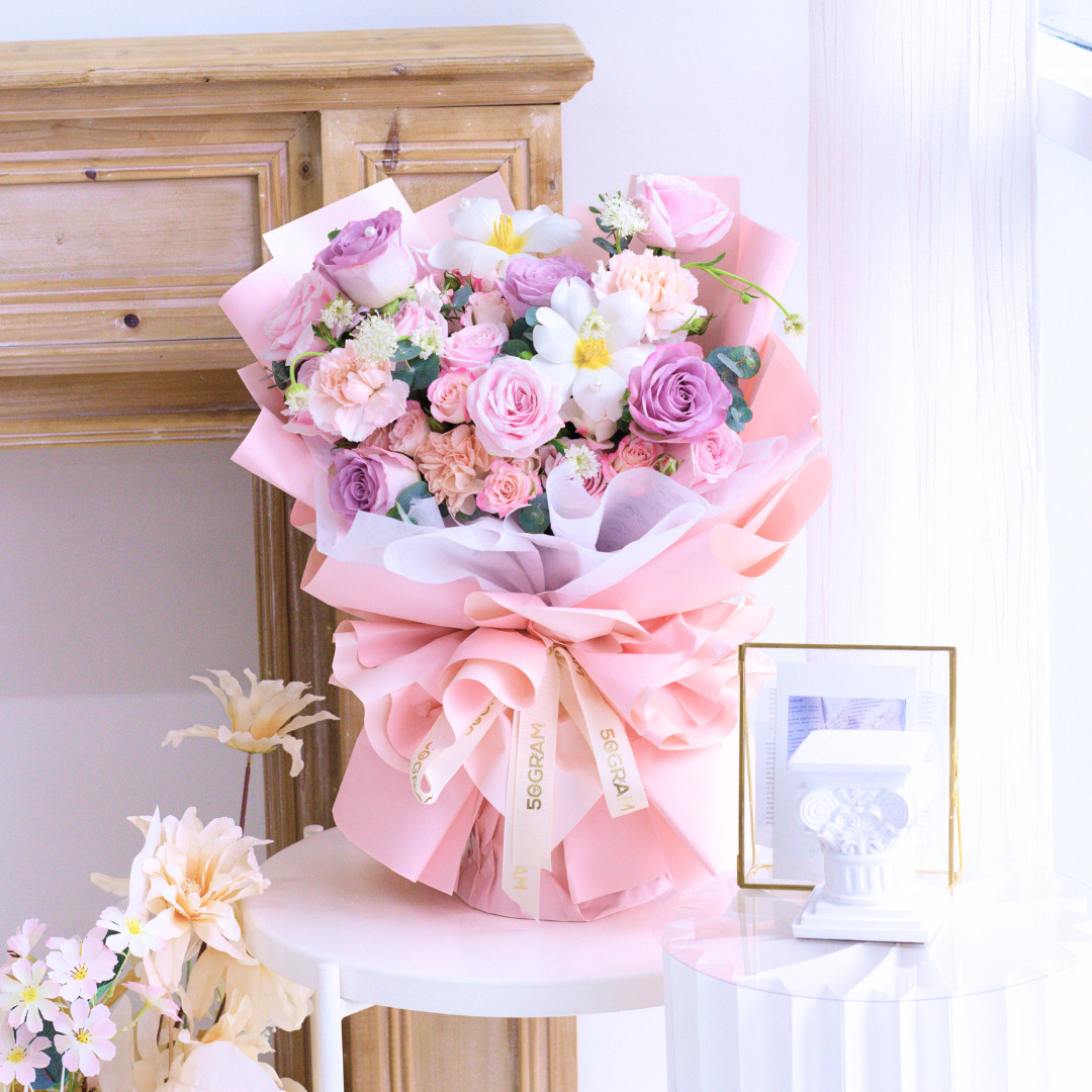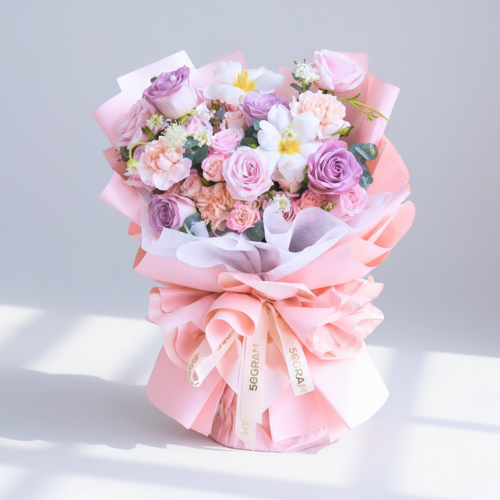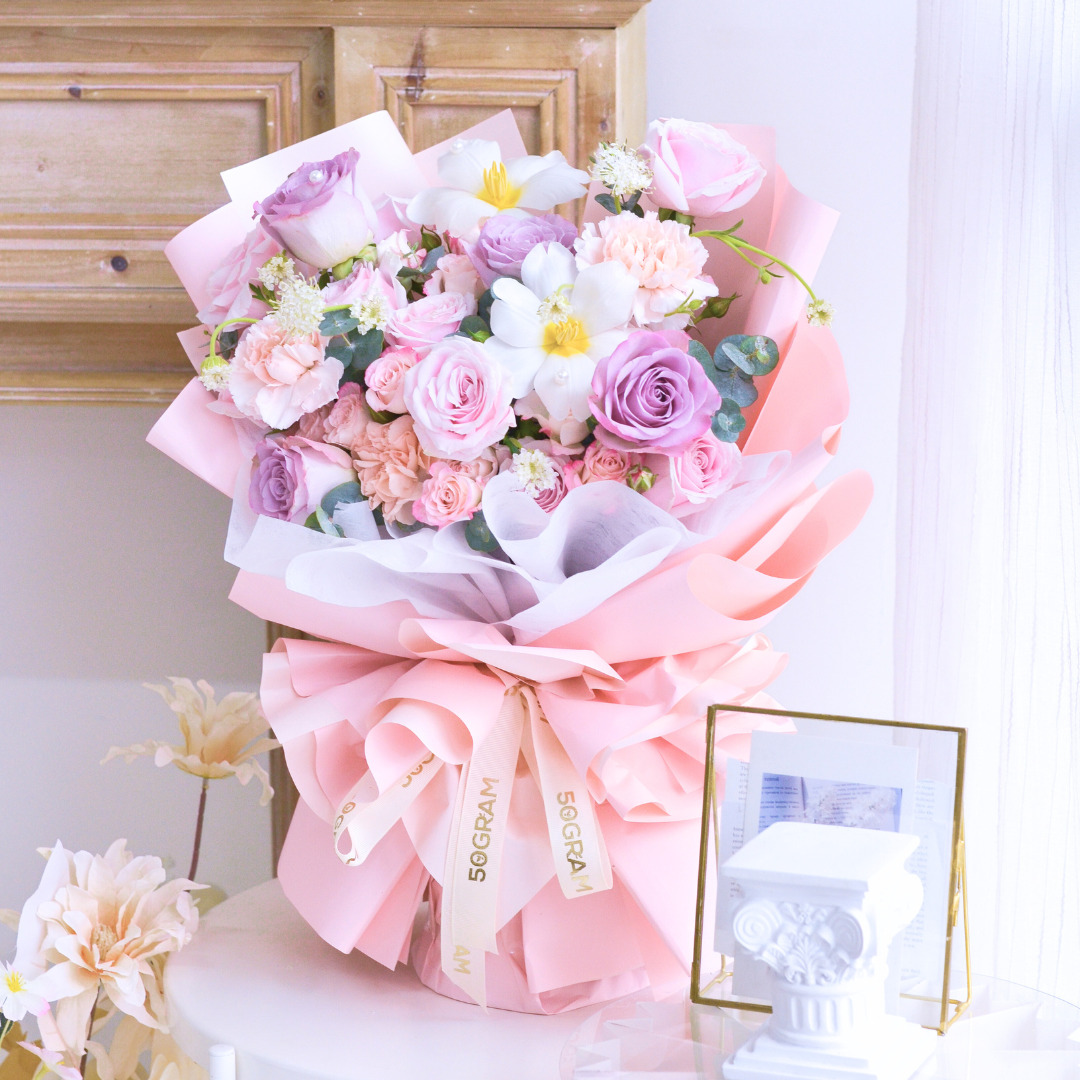 The pink and purple roses symbolize love, gratitude, and enchantment, while the white tulips add a touch of purity and grace. Together, they create a harmonious blend of colors, representing the delicate nuances of emotion and celebration.