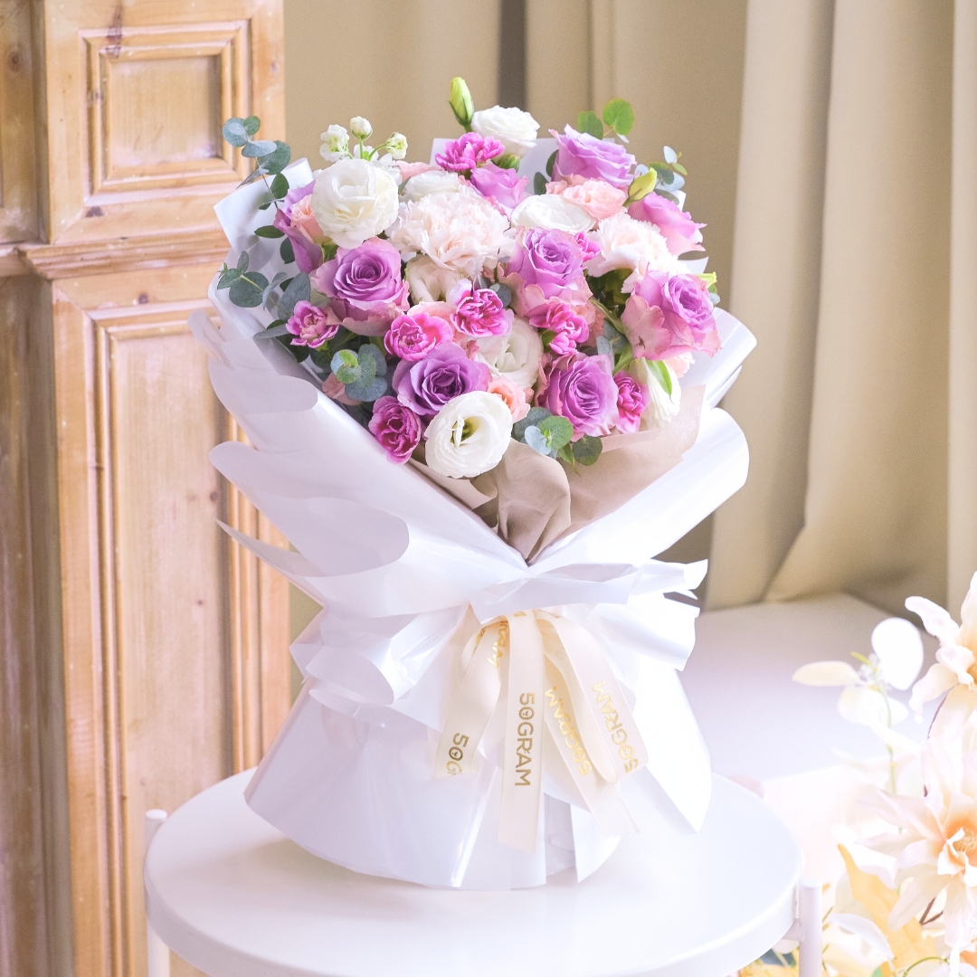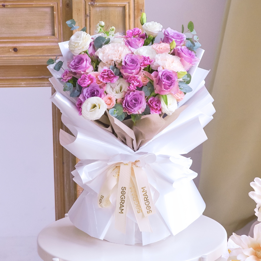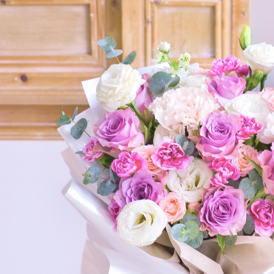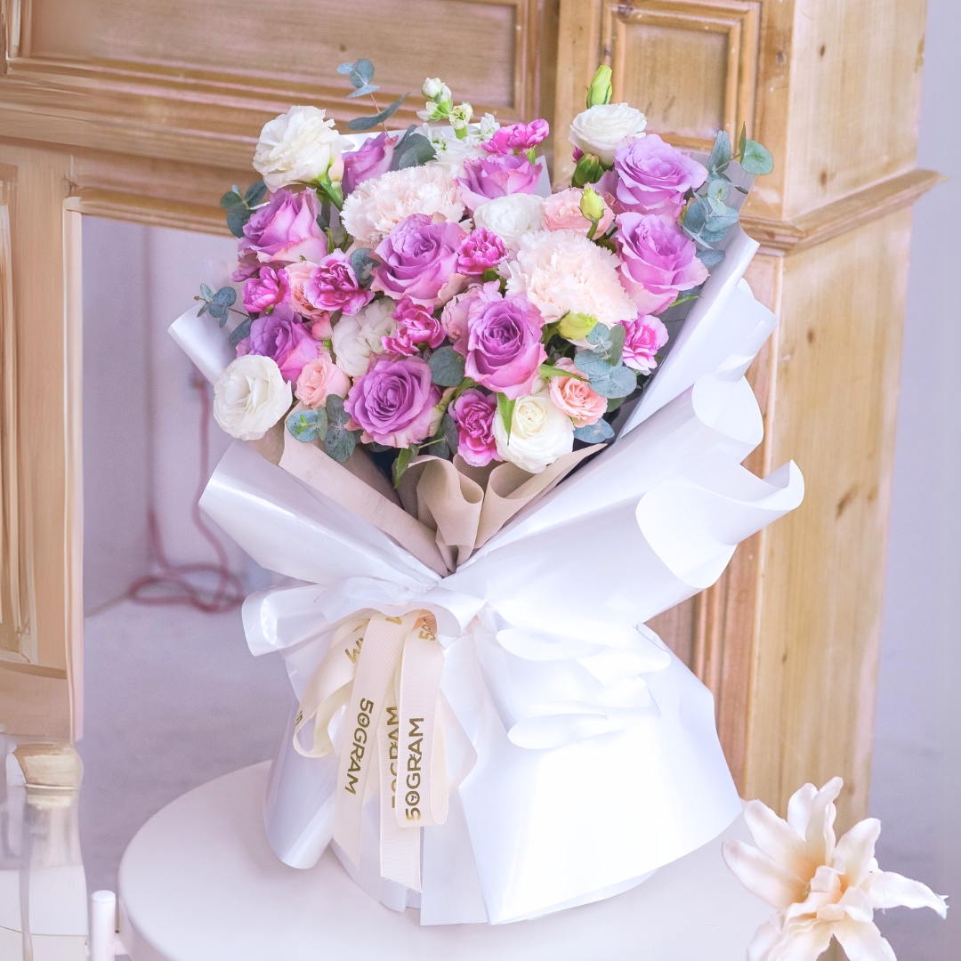 This Medium size comes with Purple Rose x 9, Brut Carnation x 2, Pink Spray Rose, 2 Tone Purple Spray Carnation, White Eustoma, White Matthiola & Eucalyptus.