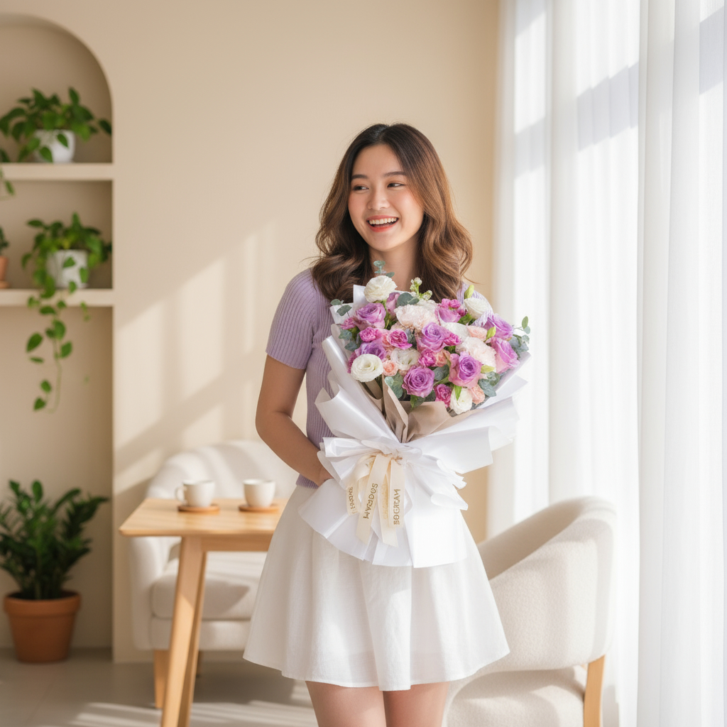 Wrapped in soft white wrapping, the bouquet embodies elegance and charm, making it a perfect gift for celebrating special moments or conveying heartfelt emotions. This luxurious floral creation is sure to leave a lasting impression. 💜🌿