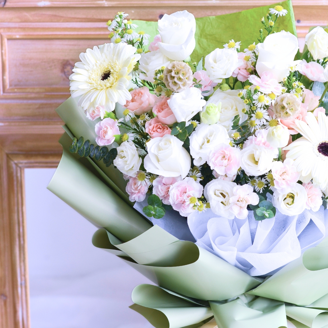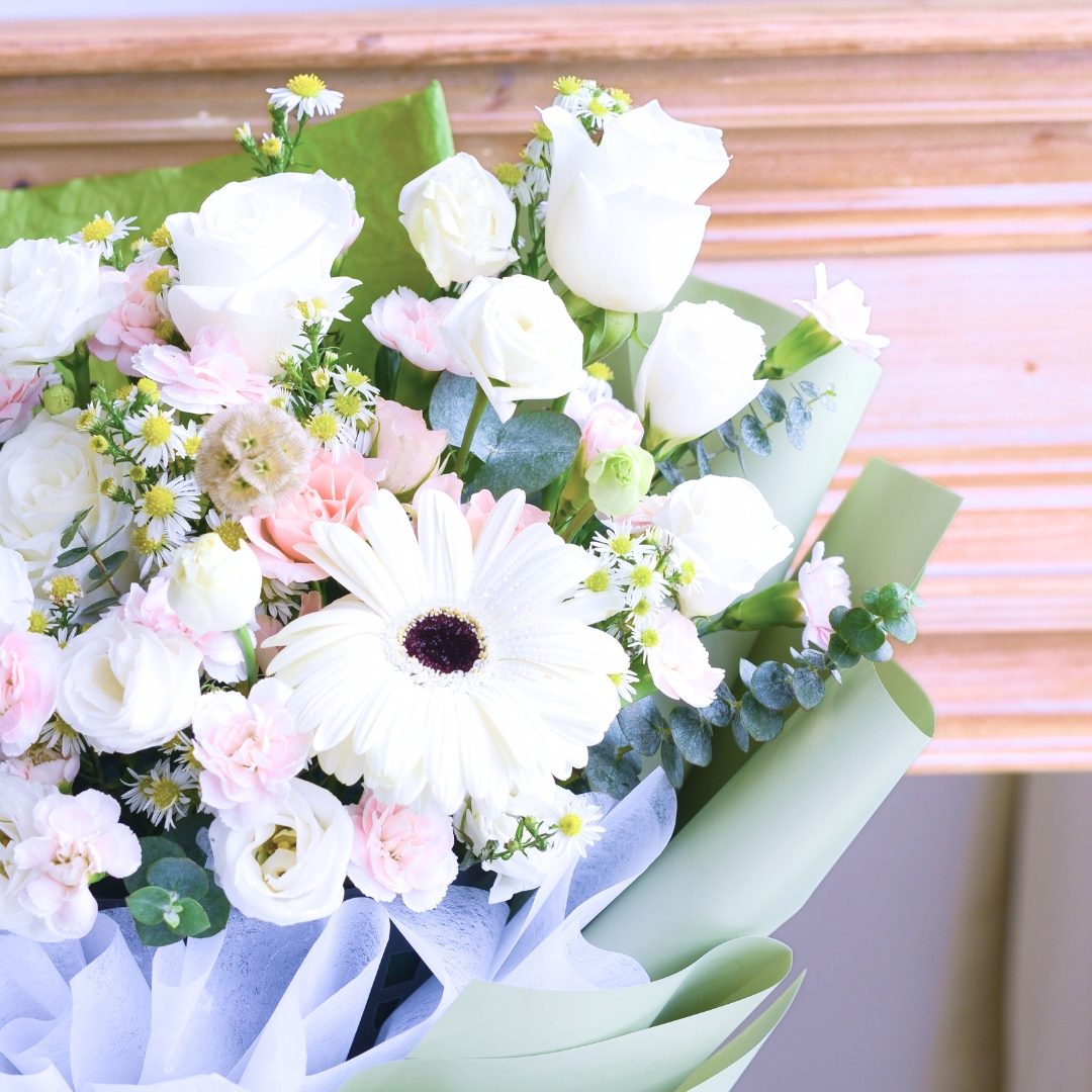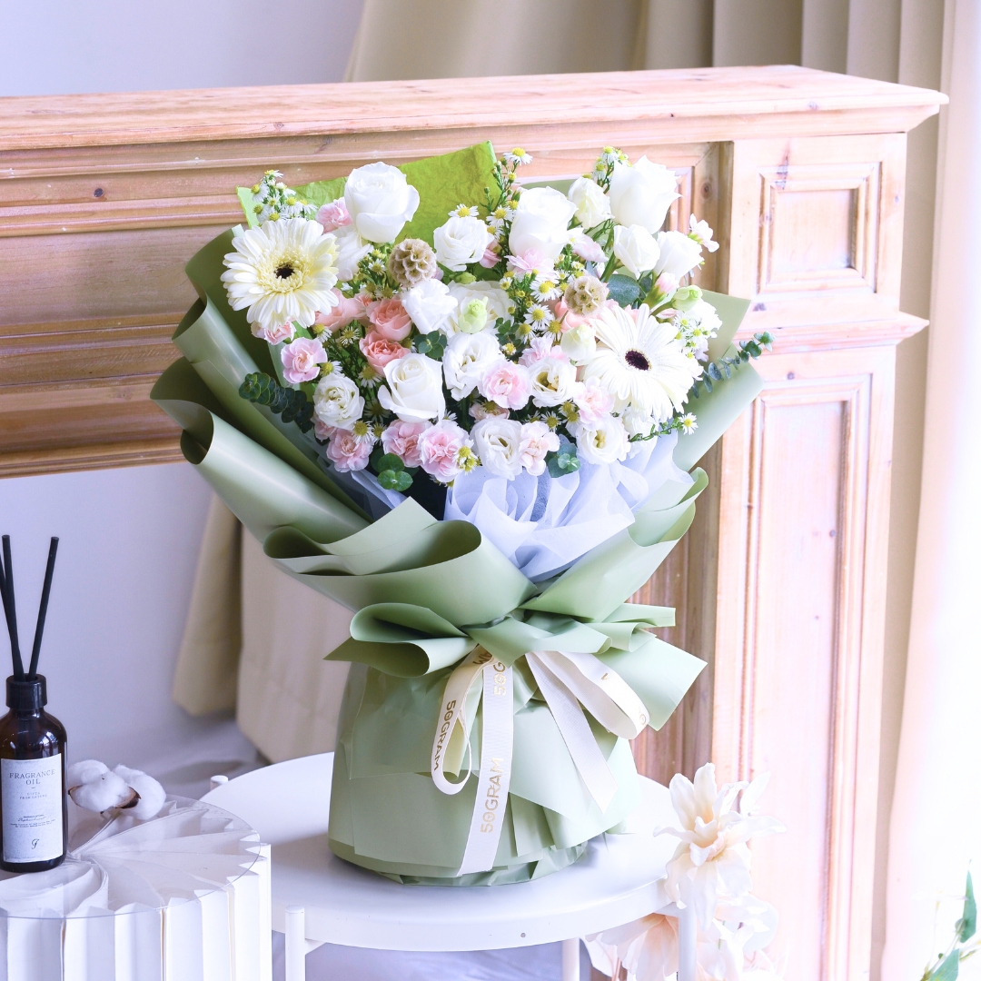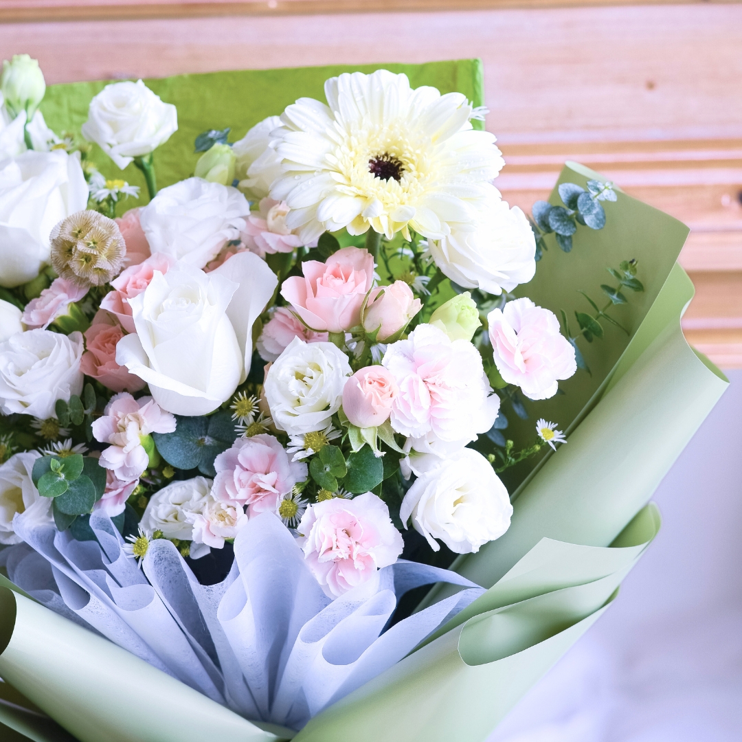 Featuring classic white gerberas and white roses, the bouquet is softened with sweet pink spray roses and pink spray carnations. White eustoma and peacock white blooms add lightness and depth, while scabiosa brown introduces an earthy contrast. Finished with airy eucalyptus baby blue, the arrangement feels fresh, timeless, and effortlessly graceful.