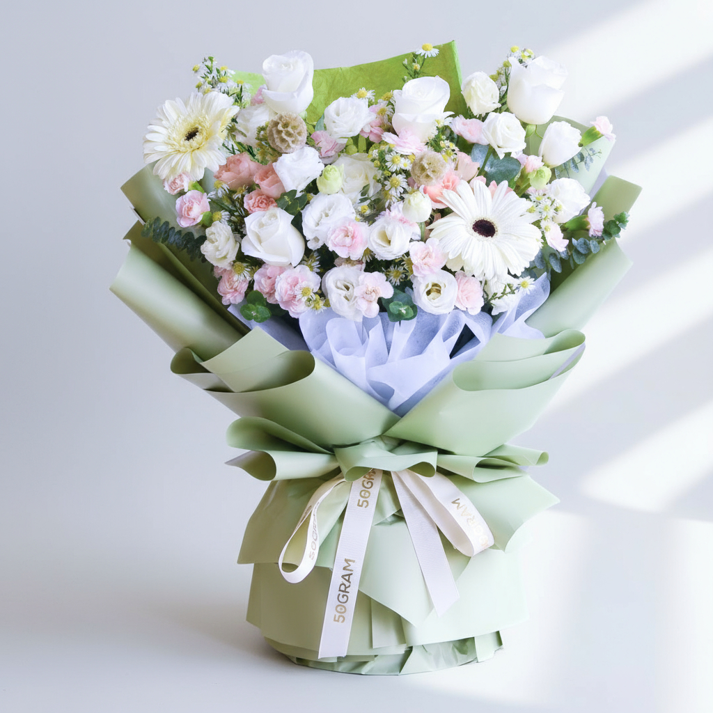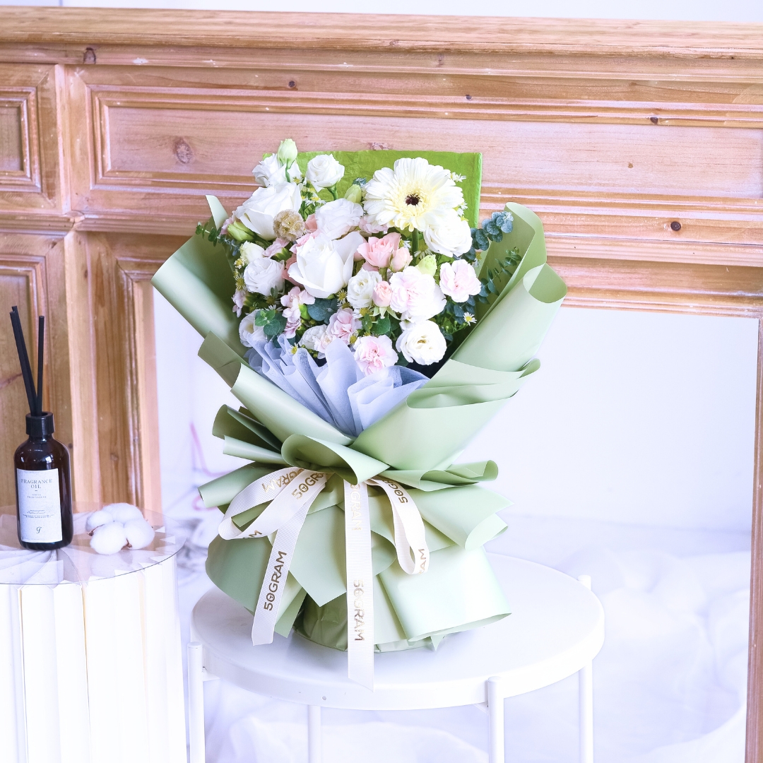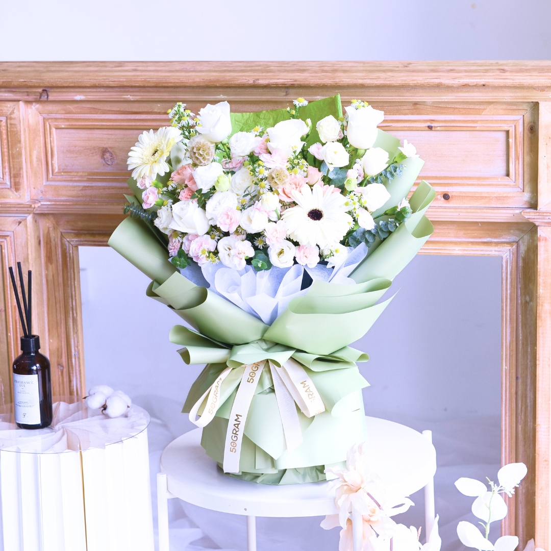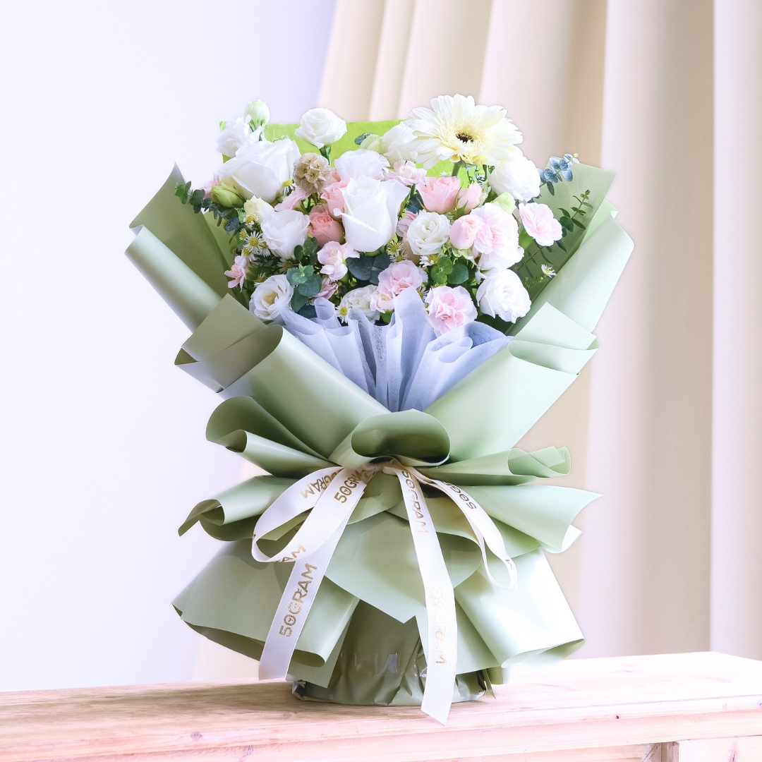 Featuring classic white gerberas and white roses, the bouquet is softened with sweet pink spray roses and pink spray carnations. White eustoma and peacock white blooms add lightness and depth, while scabiosa brown introduces an earthy contrast. Finished with airy eucalyptus baby blue, the arrangement feels fresh, timeless, and effortlessly graceful.