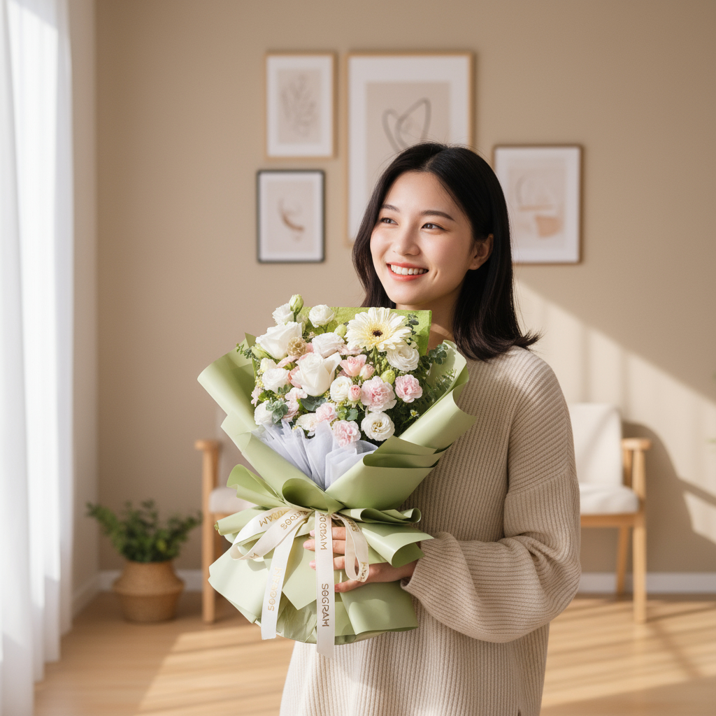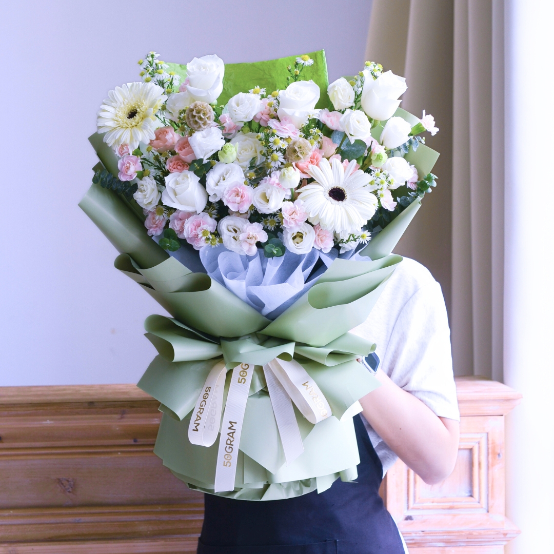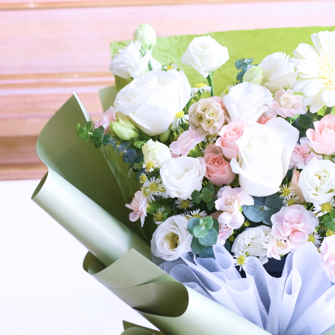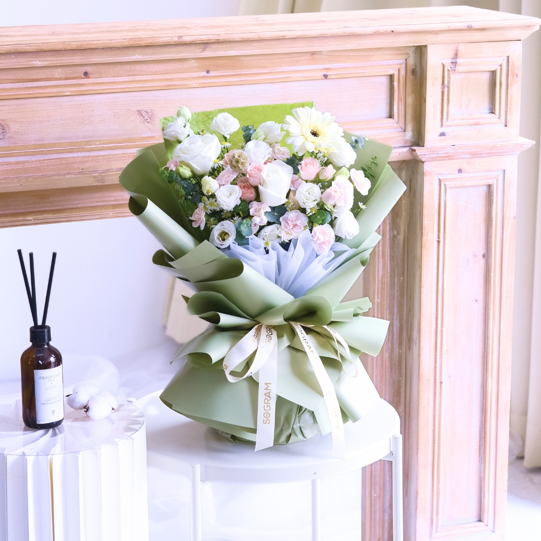 Featuring classic white gerberas and white roses, the bouquet is softened with sweet pink spray roses and pink spray carnations. White eustoma and peacock white blooms add lightness and depth, while scabiosa brown introduces an earthy contrast. Finished with airy eucalyptus baby blue, the arrangement feels fresh, timeless, and effortlessly graceful.