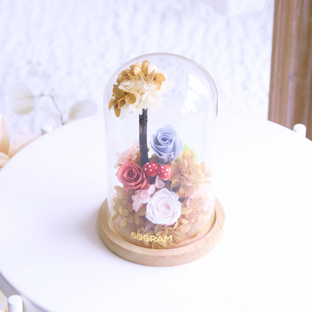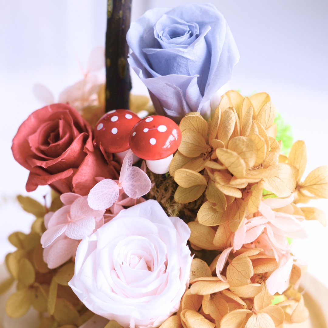 The “Woodland Whisper Preserved Flower” arrangement features a charming mix of blue, red, and pink preserved roses, complemented by beige hydrangea and whimsical mushroom props. This enchanting display evokes the beauty and tranquility of a magical forest, bringing a touch of nature’s wonder to any space. 🌹🍄🌿