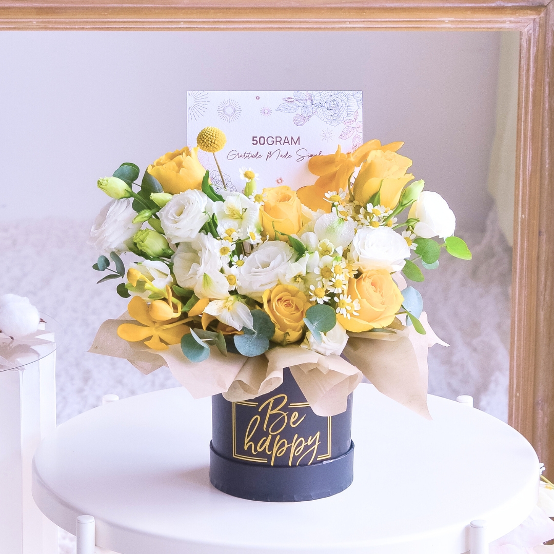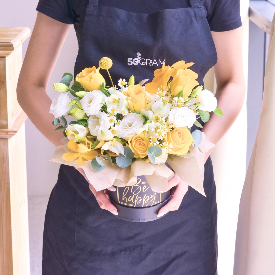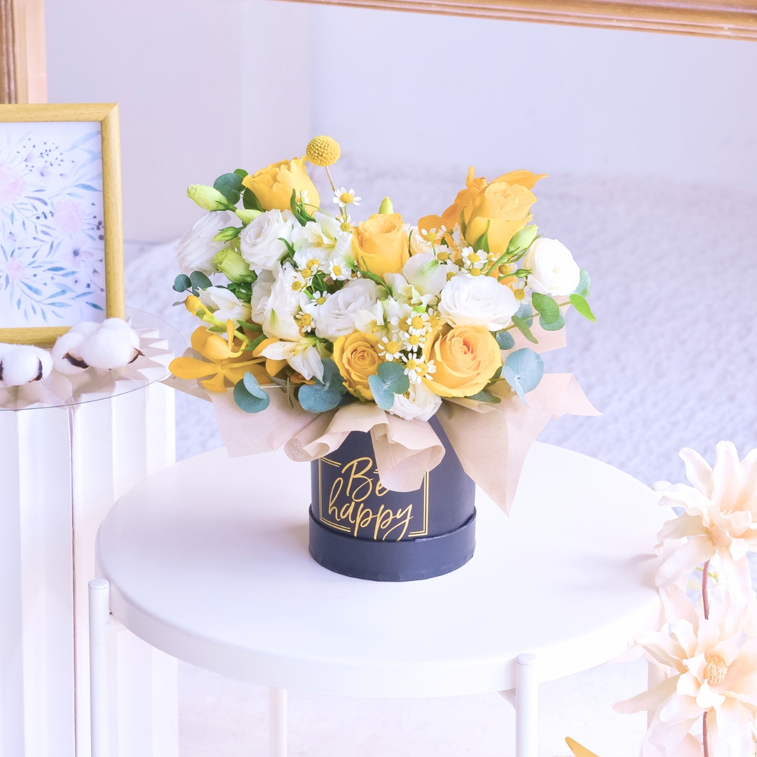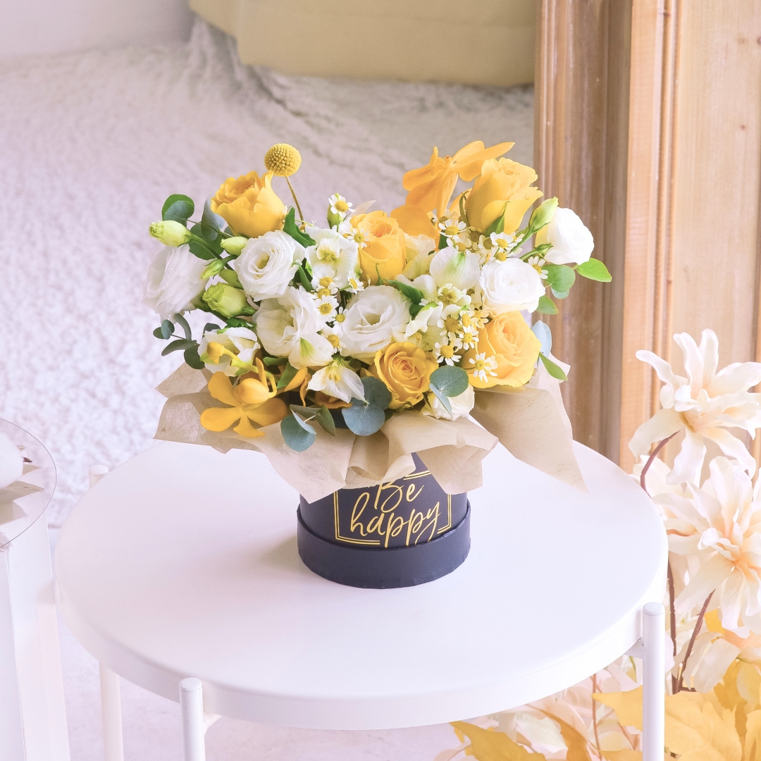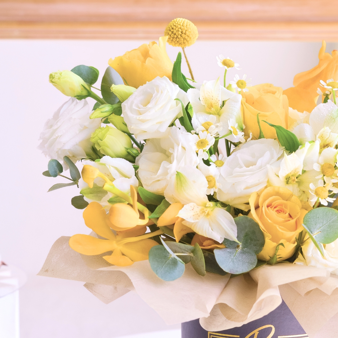 This flower box comes with Yellow Rose x 5, Yellow Orchid x 1, White Alstroemelia x 1, White Eustoma, Chamomile, Yellow Craspedia & Eucalyptus.