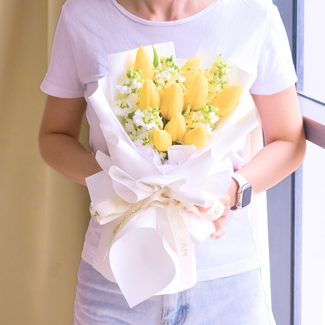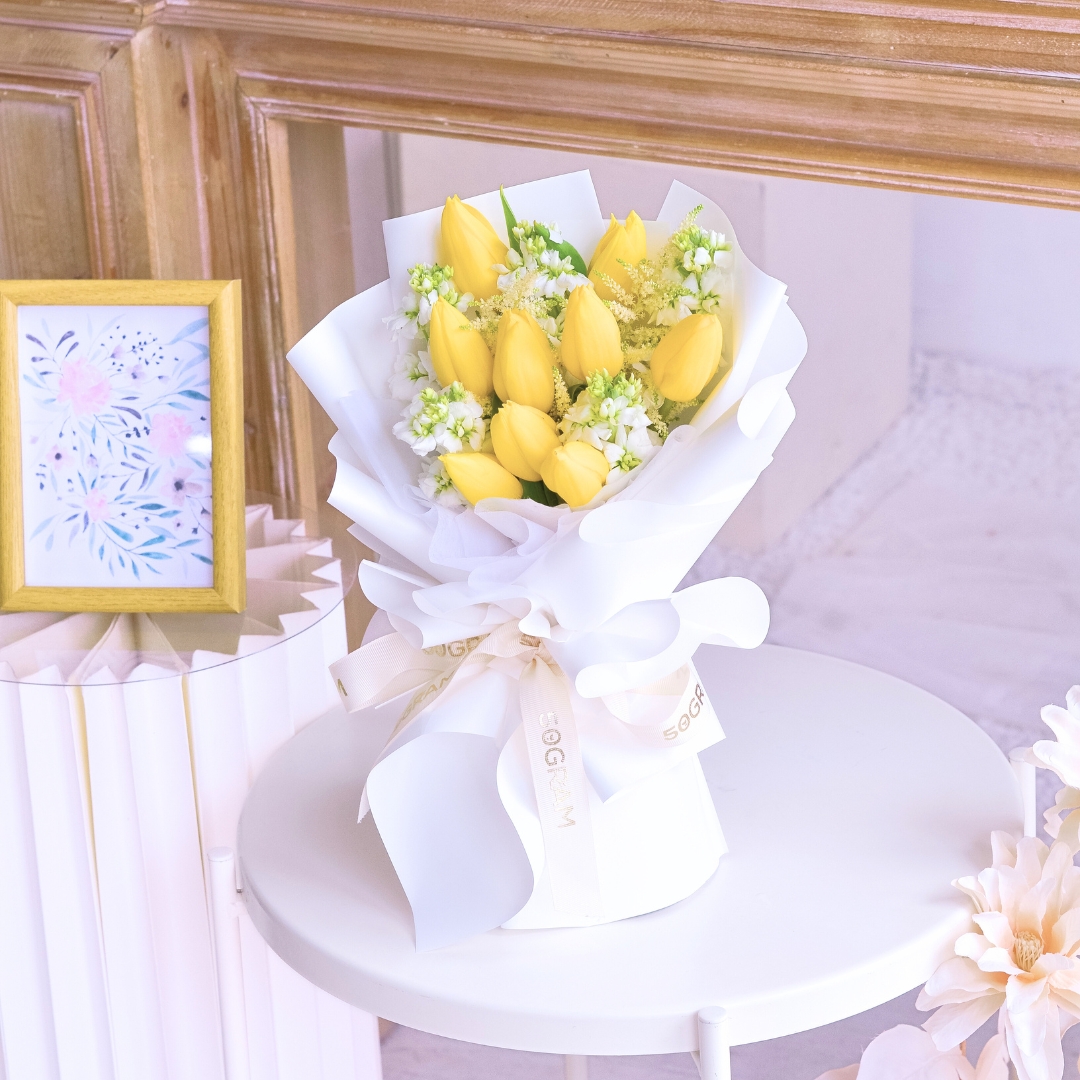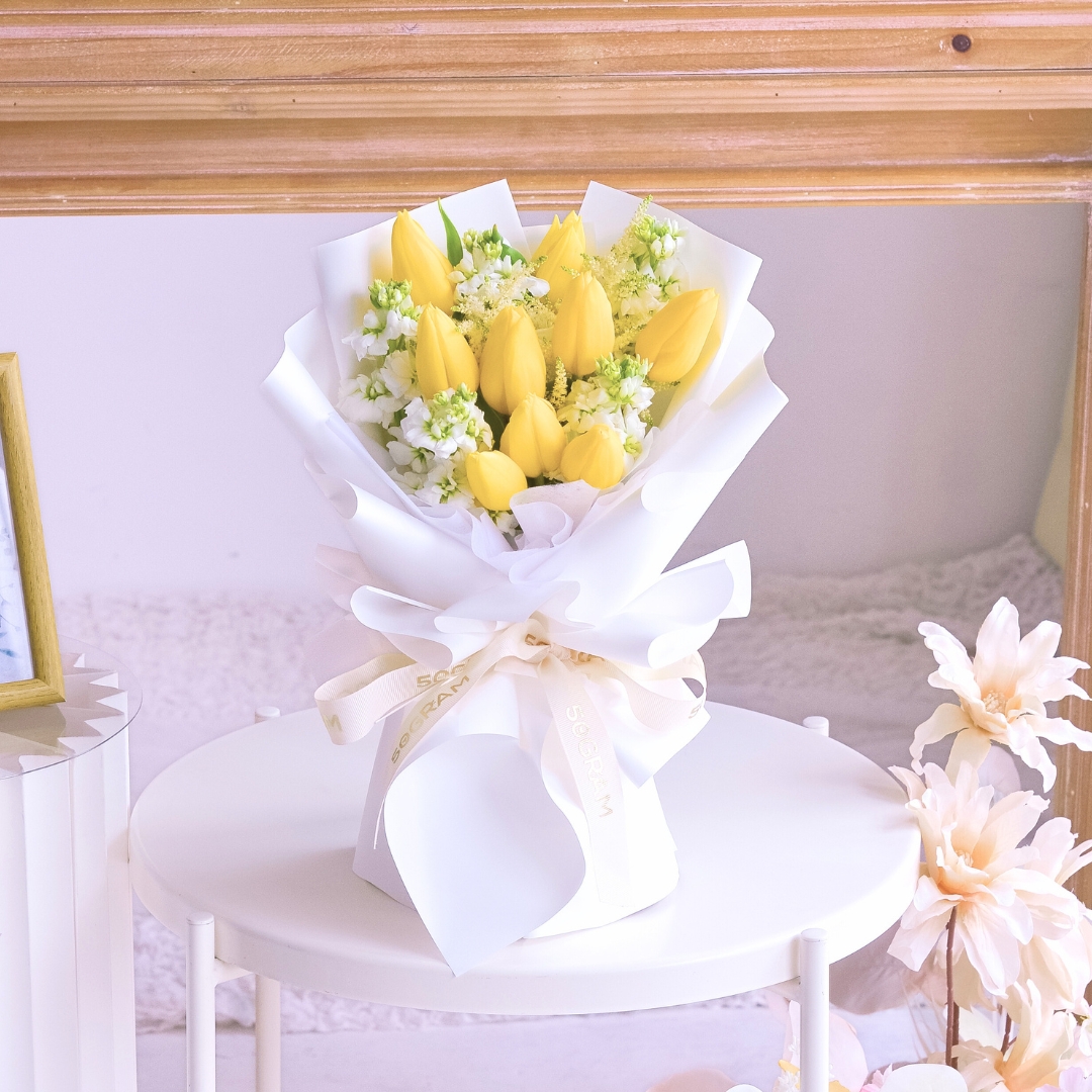 This Regular size bouquet comes with Yellow Tulip x 8-10 , White Matthiola x 5 & White Astilbe.