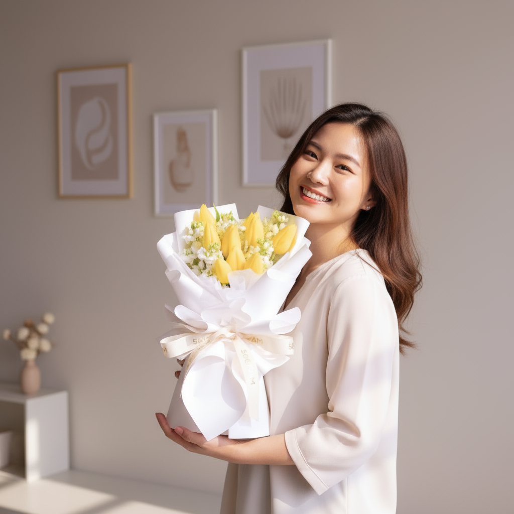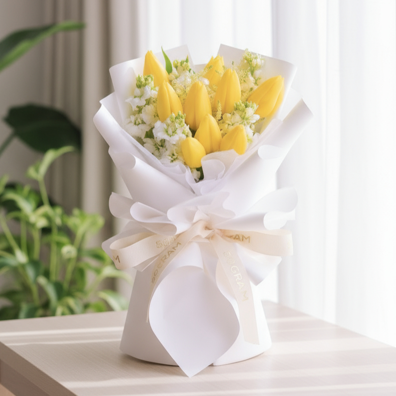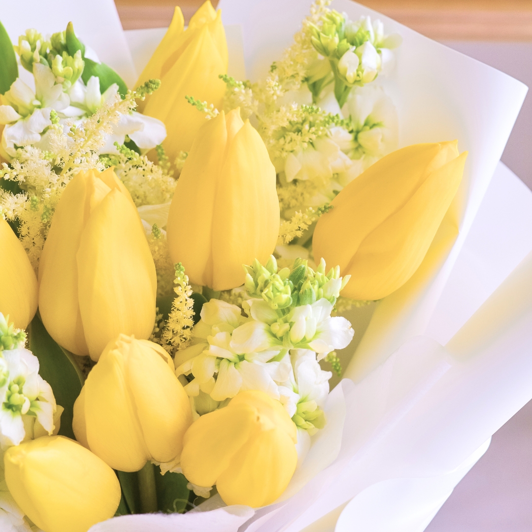This Regular size bouquet comes with Yellow Tulip x 8-10 , White Matthiola x 5 & White Astilbe.
